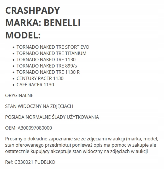 Заказывая «, CRASHPAD CRASPADY GMOL КОВЕР BENELLI TORNADO NAKED CAFE RACER» данное изделие из «Osłona silnika, skrzyni biegów» вы можете быть уверены, что после оформления заказа, доставки в Украину, вы получите именно то, что заказывали, в оговоренные сроки и европейского качества.