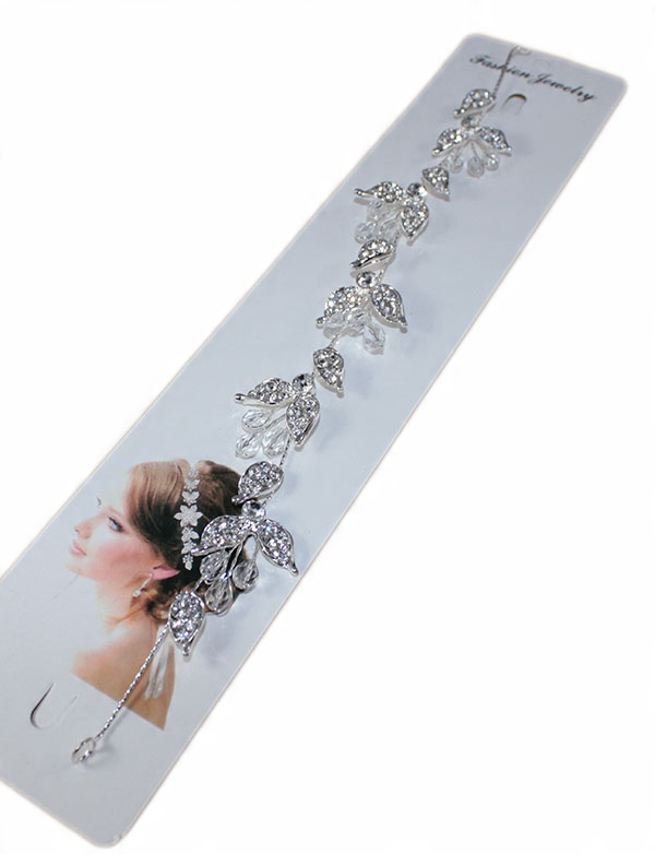 Диадема – украшение для подвешивания. На витую металлическую проволоку крепятся веточки с листьями, усыпанные более мелкими кристаллами цирконов и небольшими гроздьями с тремя вытянутыми кристаллами.