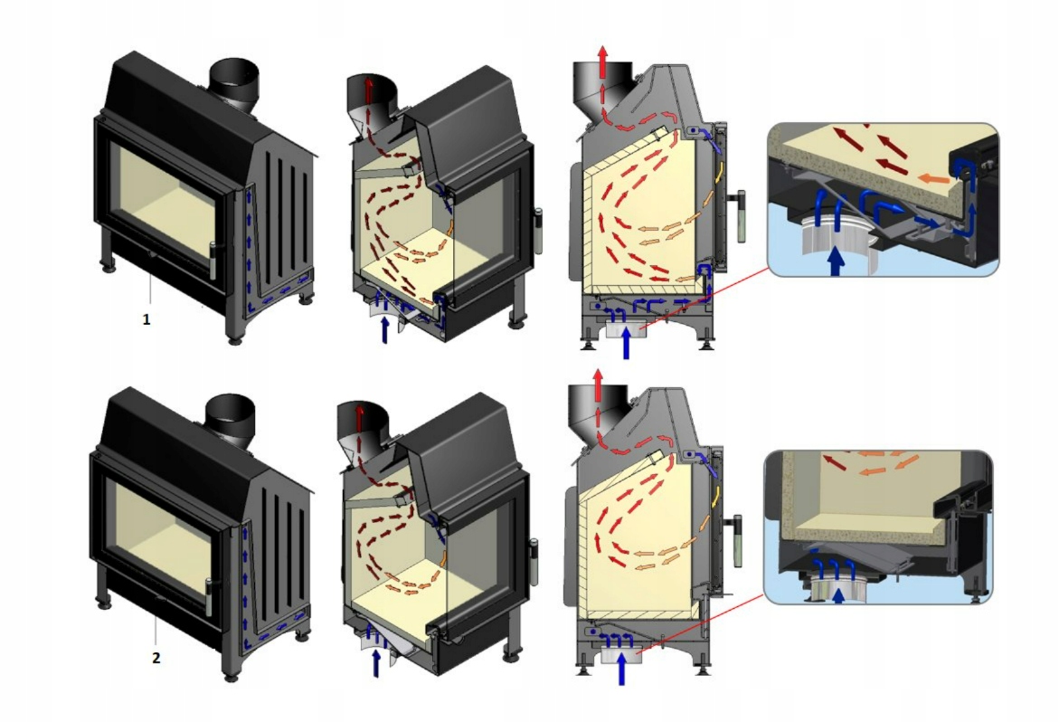 Кроме того, во вставке используется система чистого стекла (воздушная завеса), т.е. воздух подается напрямую к стеклу через систему каналов, расположенных по бокам камина. Таким образом кислород подается в верхнюю часть камеры сгорания, где дожигаются газы, образующиеся в процессе сгорания древесины, что дополнительно снижает выбросы вредного CO в атмосферу.