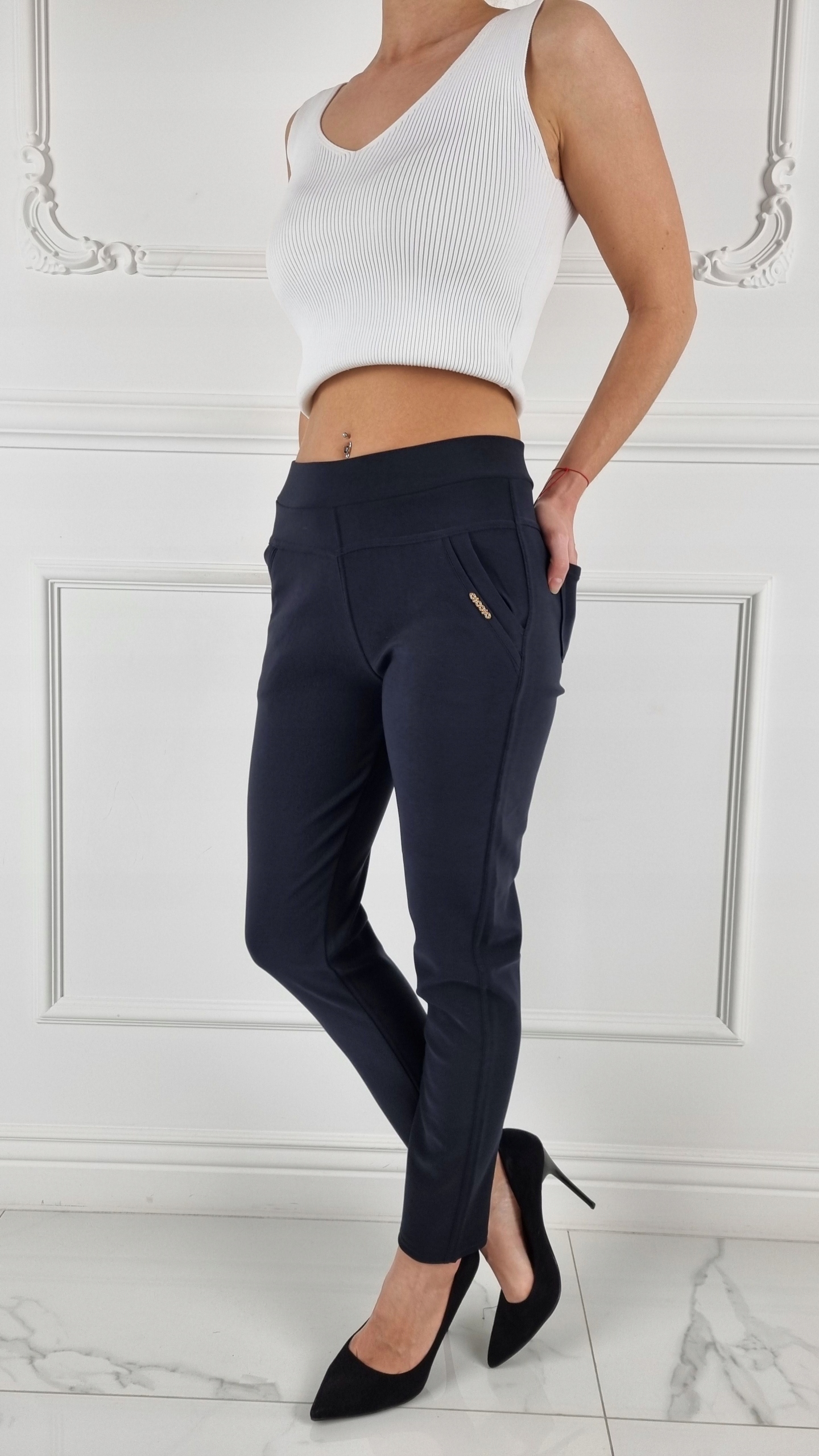 Большой гибкий сужаемый брюк, благодаря их универсальности, подходит почти каждому стилизации. Гибкий материал подчеркивает женскую фигуру. Они будут работать отлично каждый день, а также для больших результатов. Заполните их высокими каблуками и блузкой и создайте идеальный набор! Подчеркните свои женские формы! Сделайте свой ежедневный вид уникальным. Брюки с обеих сторон имеют карманы.