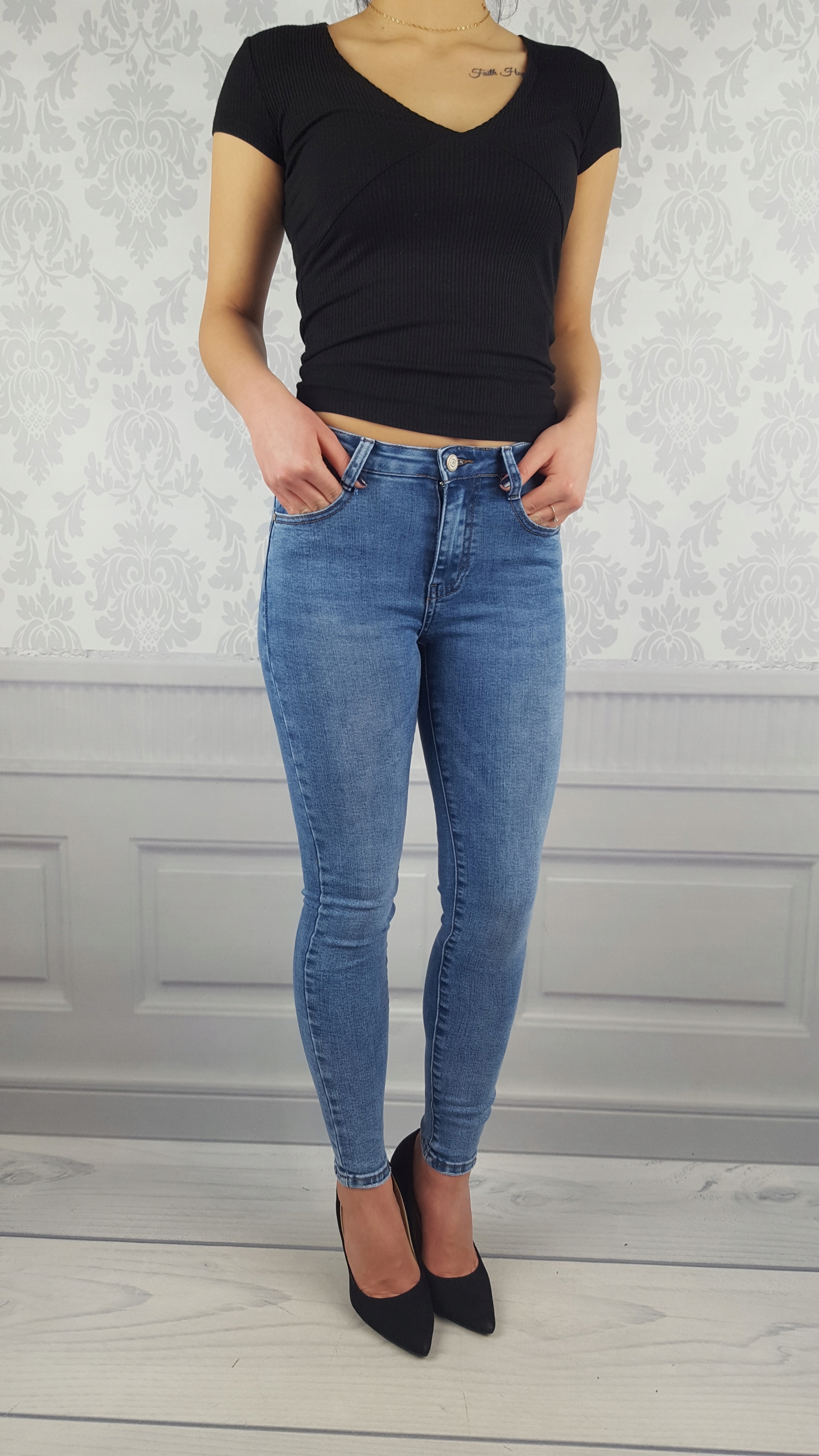 Слегка потертые джинсовые брюки, средняя талия. Отлично подходят для спортивной обуви, но идеальны. также хорошо сочетаются с обувью на высоком каблуке, поскольку благодаря своей универсальности они подходят практически к любому стилю. Гибкий материал подчеркивает женскую фигуру. Брюки приталенные и тянутся. Подчеркните свои женственные формы! Сделайте свой повседневный образ уникальным. Брюки имеют карманы с обеих сторон.