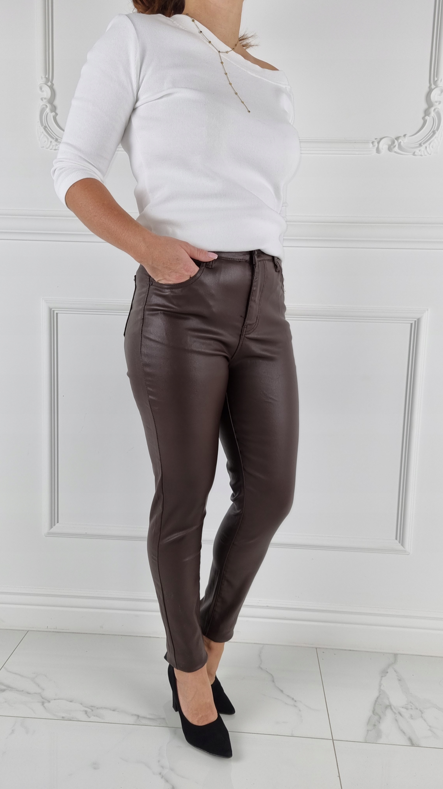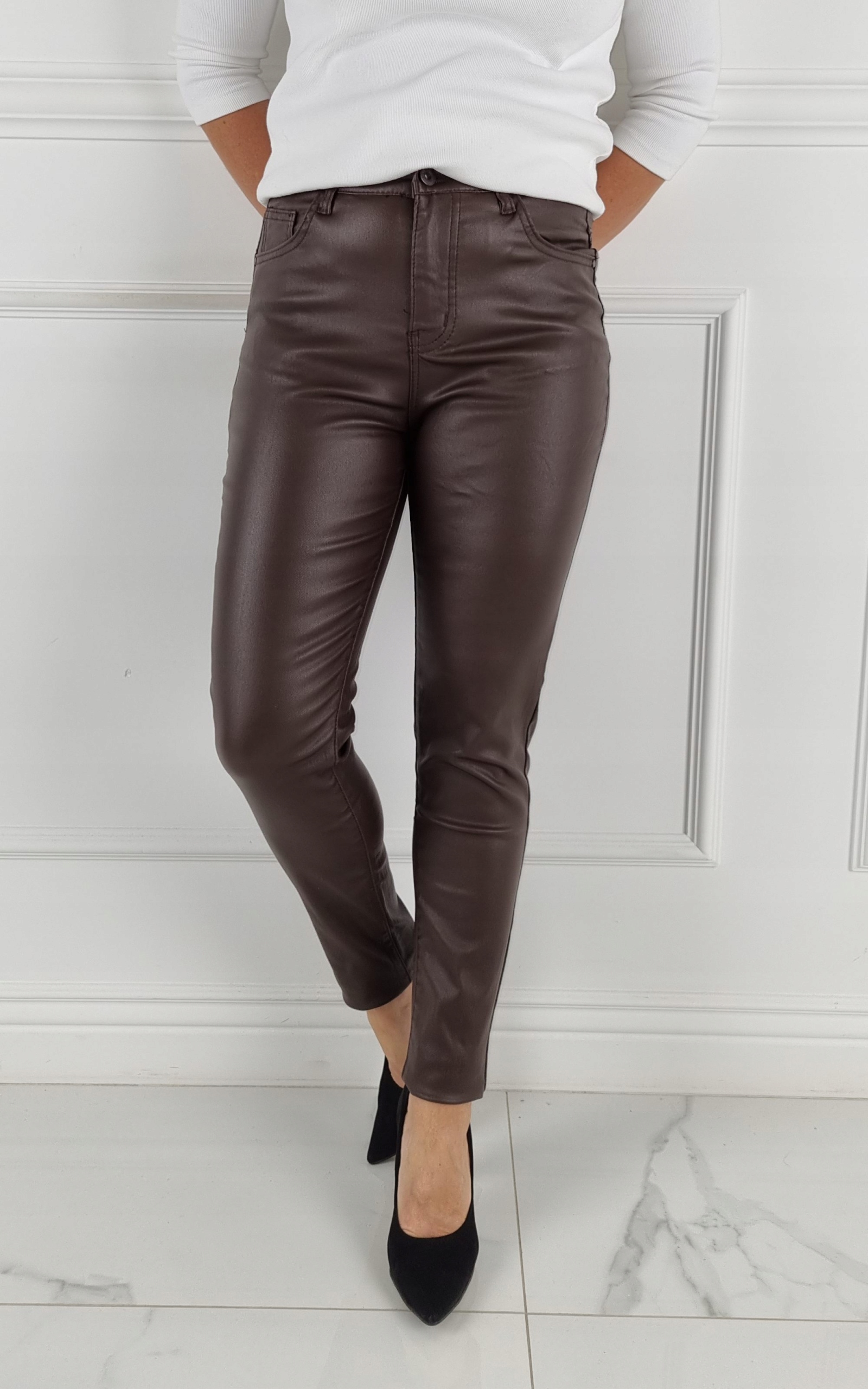 Отличные классические вощеные, УТЕПЛЕННЫЕ брюки, имитирующие кожу, с завышенной талией. б> Отлично подходят для спортивной обуви, но также идеальны в сочетании с обувью на высоком каблуке, поскольку благодаря своей универсальности подходят практически к любому стилю. Гибкий материал подчеркивает женскую фигуру. Брюки приталенные и тянутся. Подчеркните свои женственные формы! Сделайте свой повседневный образ уникальным. Брюки имеют карманы с обеих сторон.