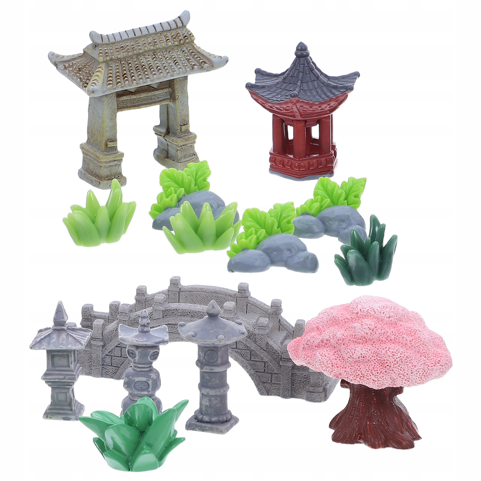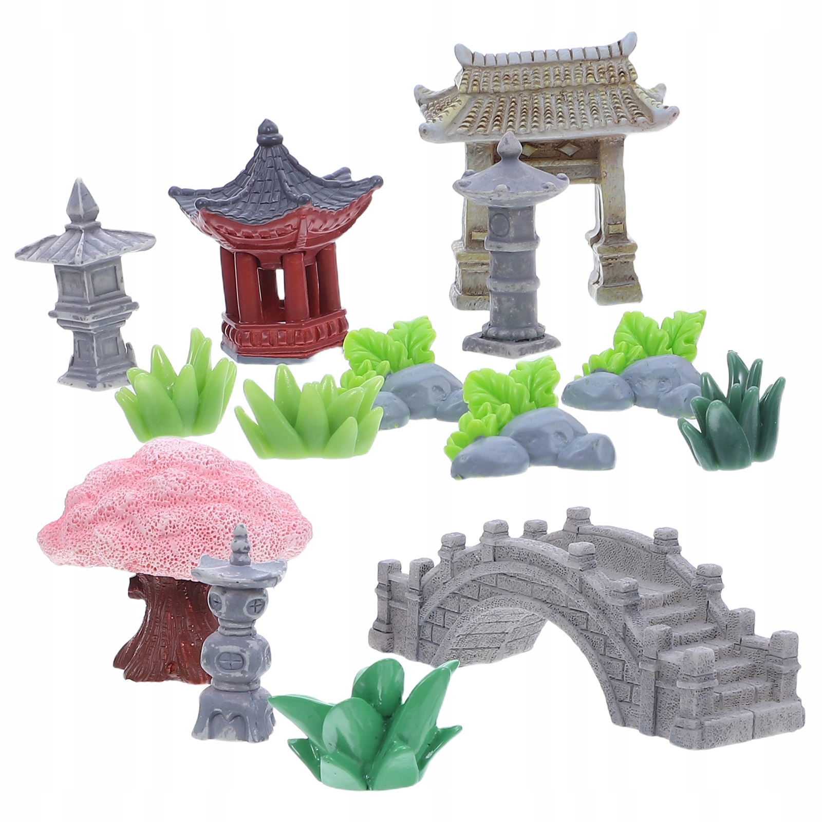 1 КОМПЛЕКТ МИНИАТЮРНЫХ ЛАНДШАФТНЫХ УКРАШЕНИЙ ИЗ СМОЛЫ С ПАВИЛЬОНОМ И КАМЕННЫМ МОСТОМ