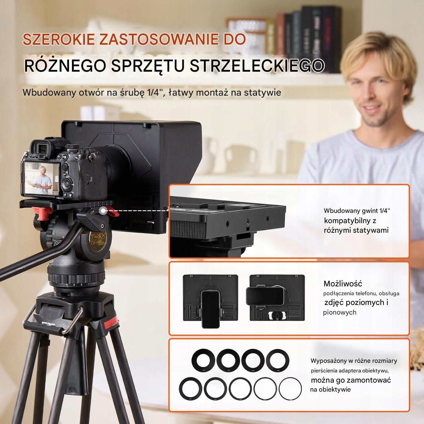 10 " Toloprompter - это профессиональное устройство, поддерживающее плавные речи перед камерой. Идеально подходит для прямой трансляции, вебинаров, видеозаписей или презентаций. Благодаря твердому дизайну и широкому совместимости с камерами, смартфонами и планшетами, он невозможно для создателей контента