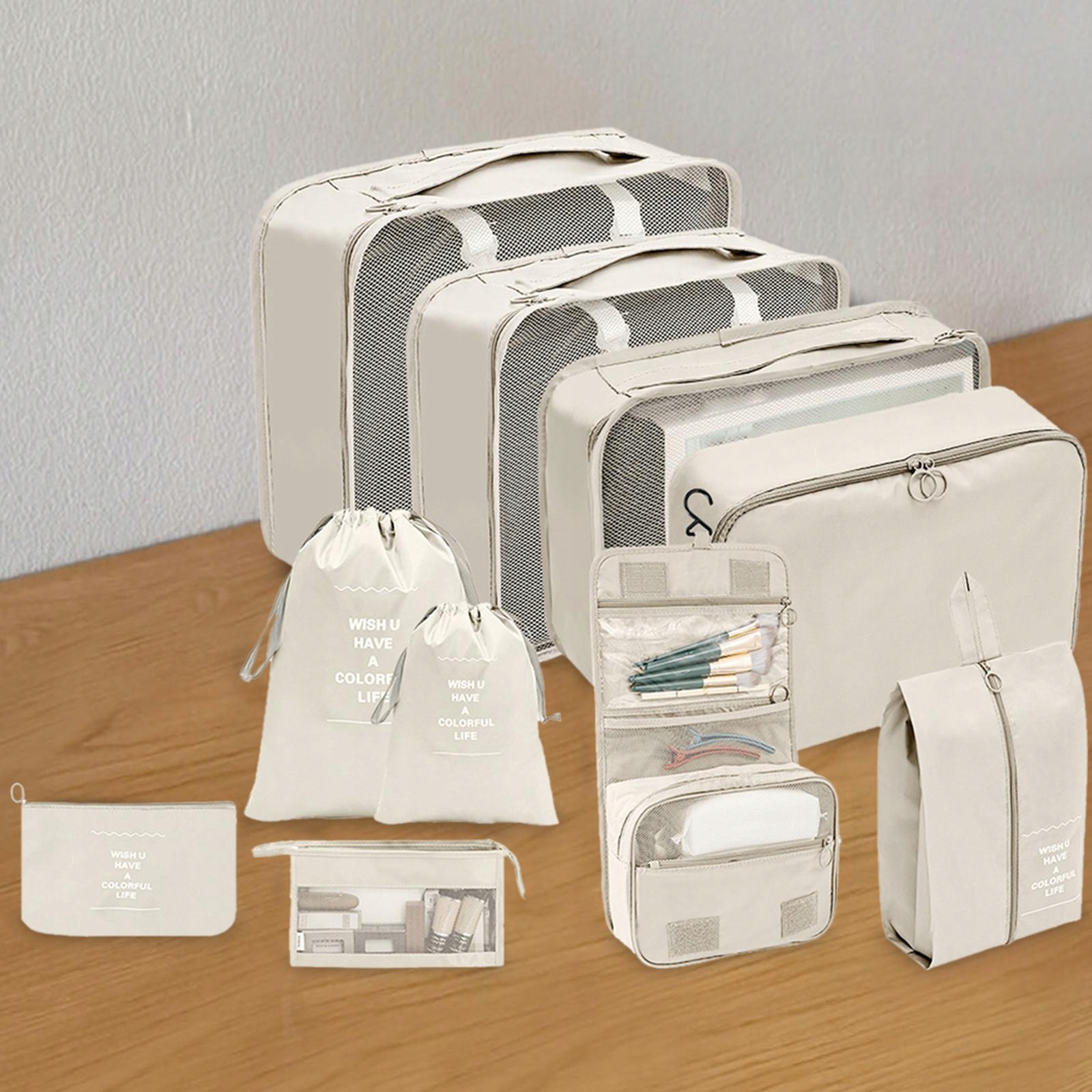 [10 кусочков путешественников для хранения]: 10 комплектов упаковочных кубиков для организаторов упаковки, в том числе большая сумка для волейбола, сумка для среднего волейбола, небольшая сумка для волейбола, большой карман с стрункой, маленькие карманы с стрункой, мешок для белья, плоский карман, туфли с туфлями с уловом, косметолог