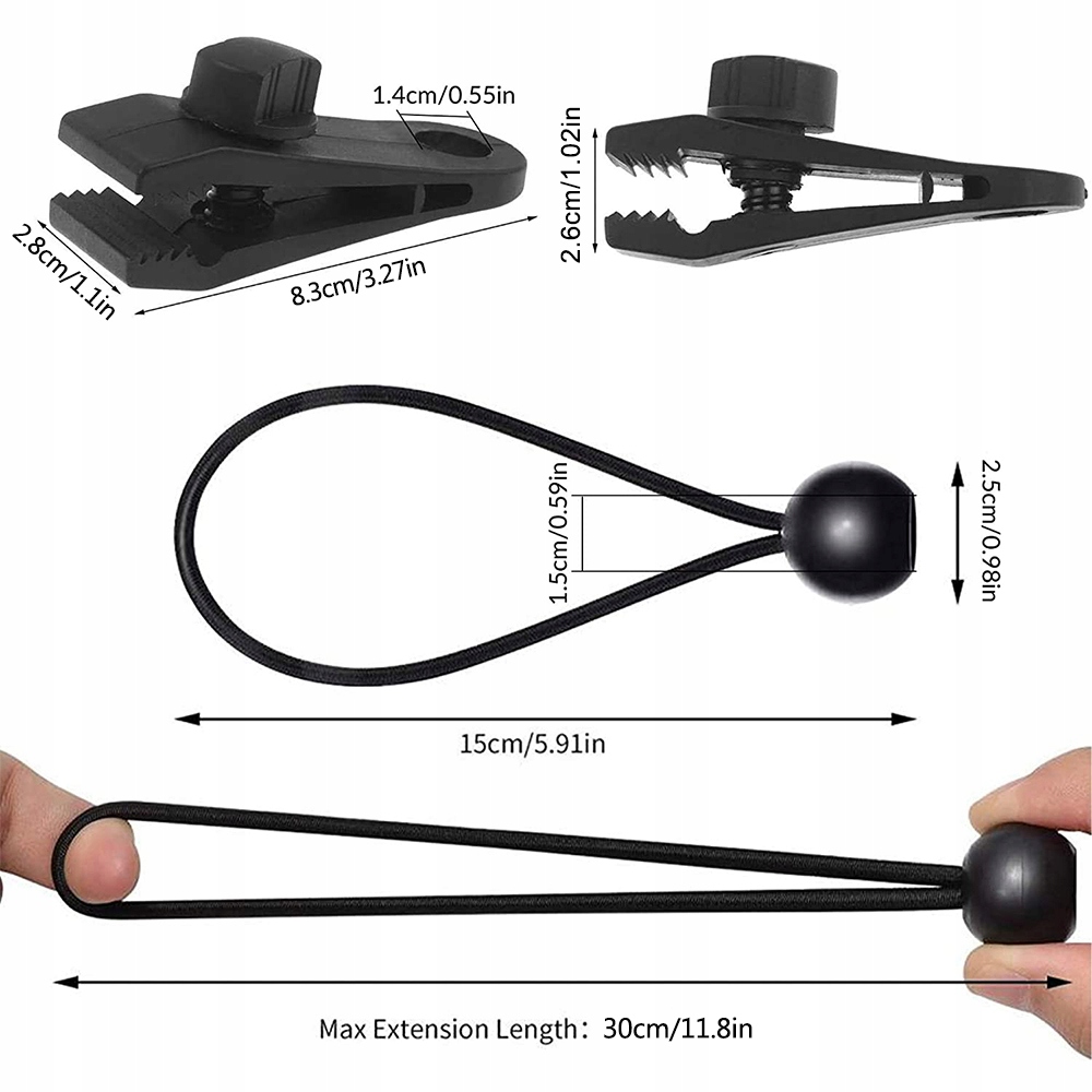 🍀Материалы и размеры зажимов для брезента:Зажим для брезента изготовлен из прочного нейлона. Размер: 8,3 см * 2,8 см * 2,6 см; Банджи-шнур изготовлен из пластика и имеет прочный банджи-шнур. Размеры: 15 см * 2,5 см.