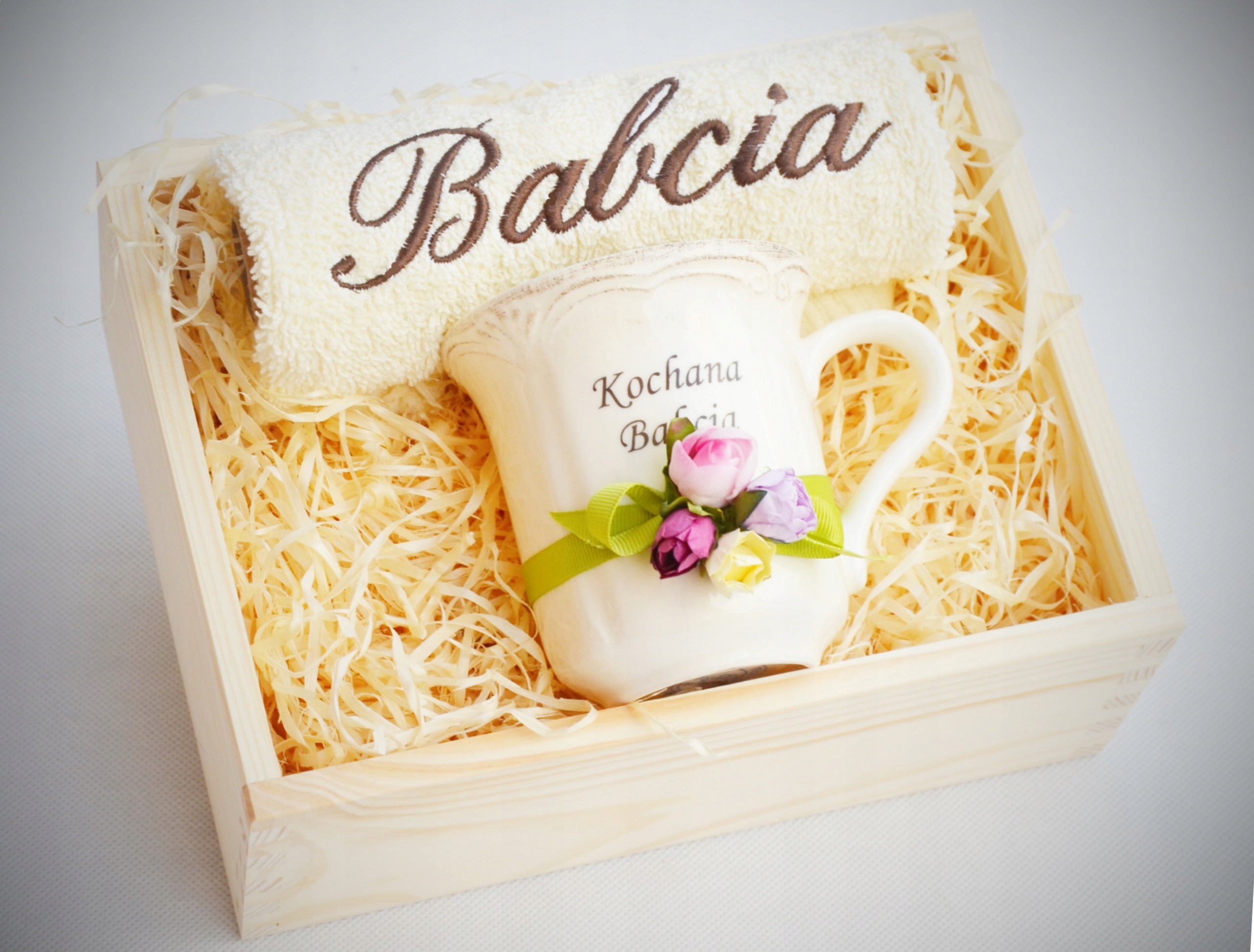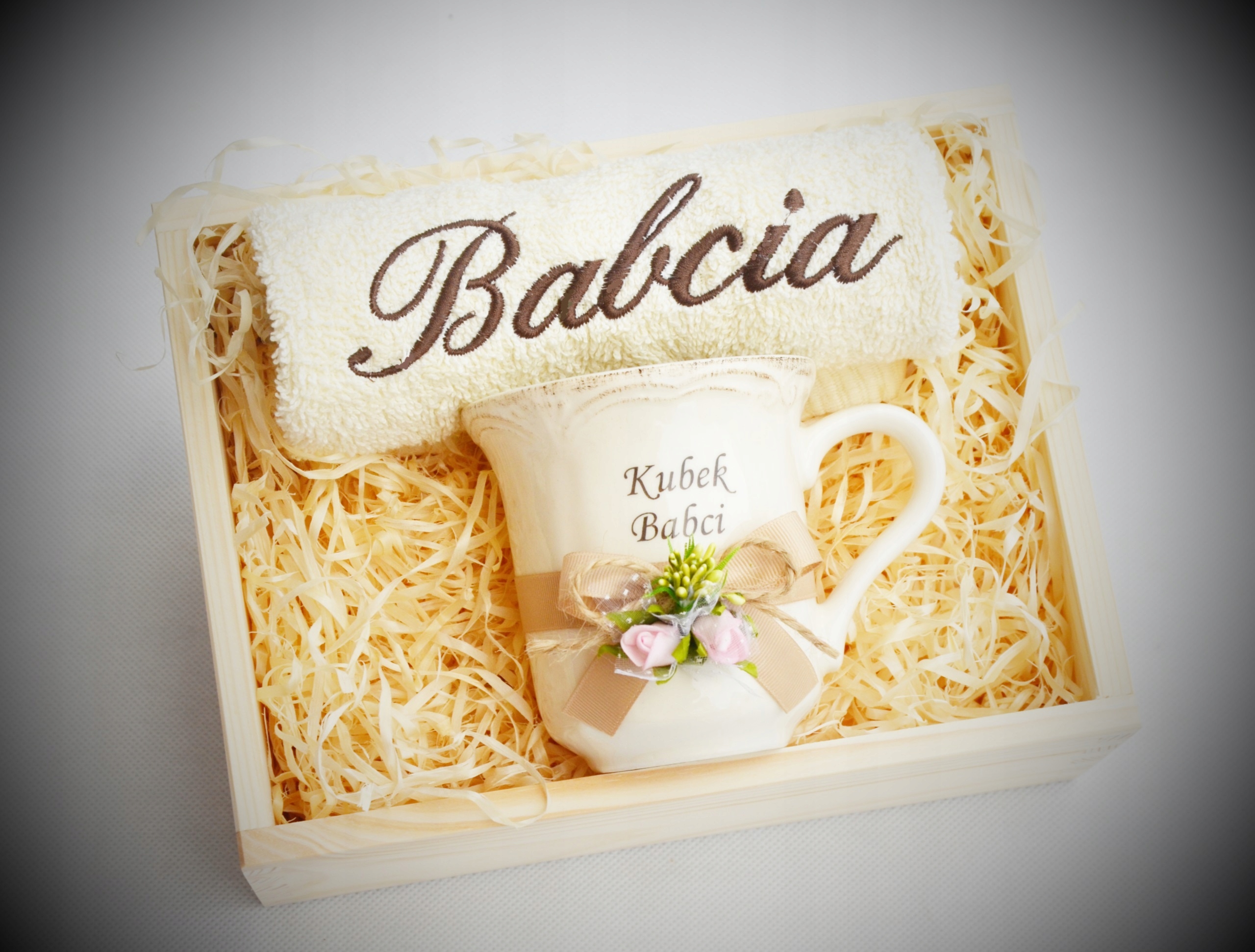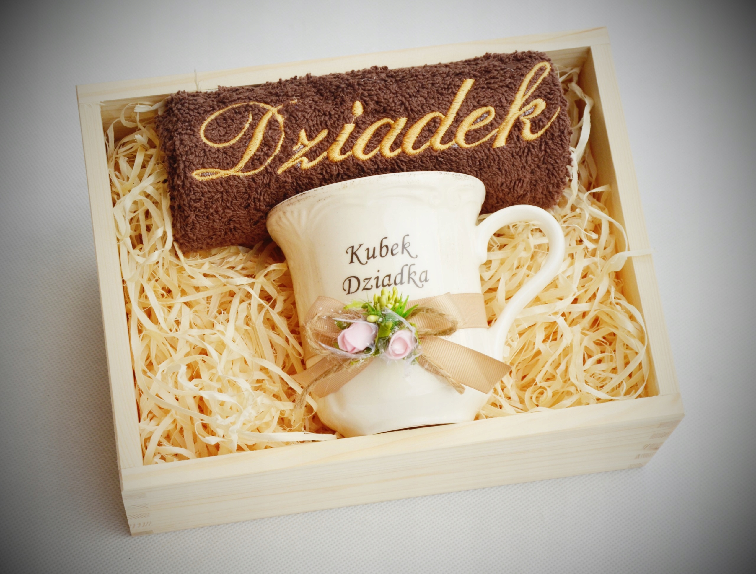 Красивый и практичный подарок ко Дню бабушки и дедушки — вышитое полотенце, фарфоровая кружка — все красиво оформлено и упаковано.