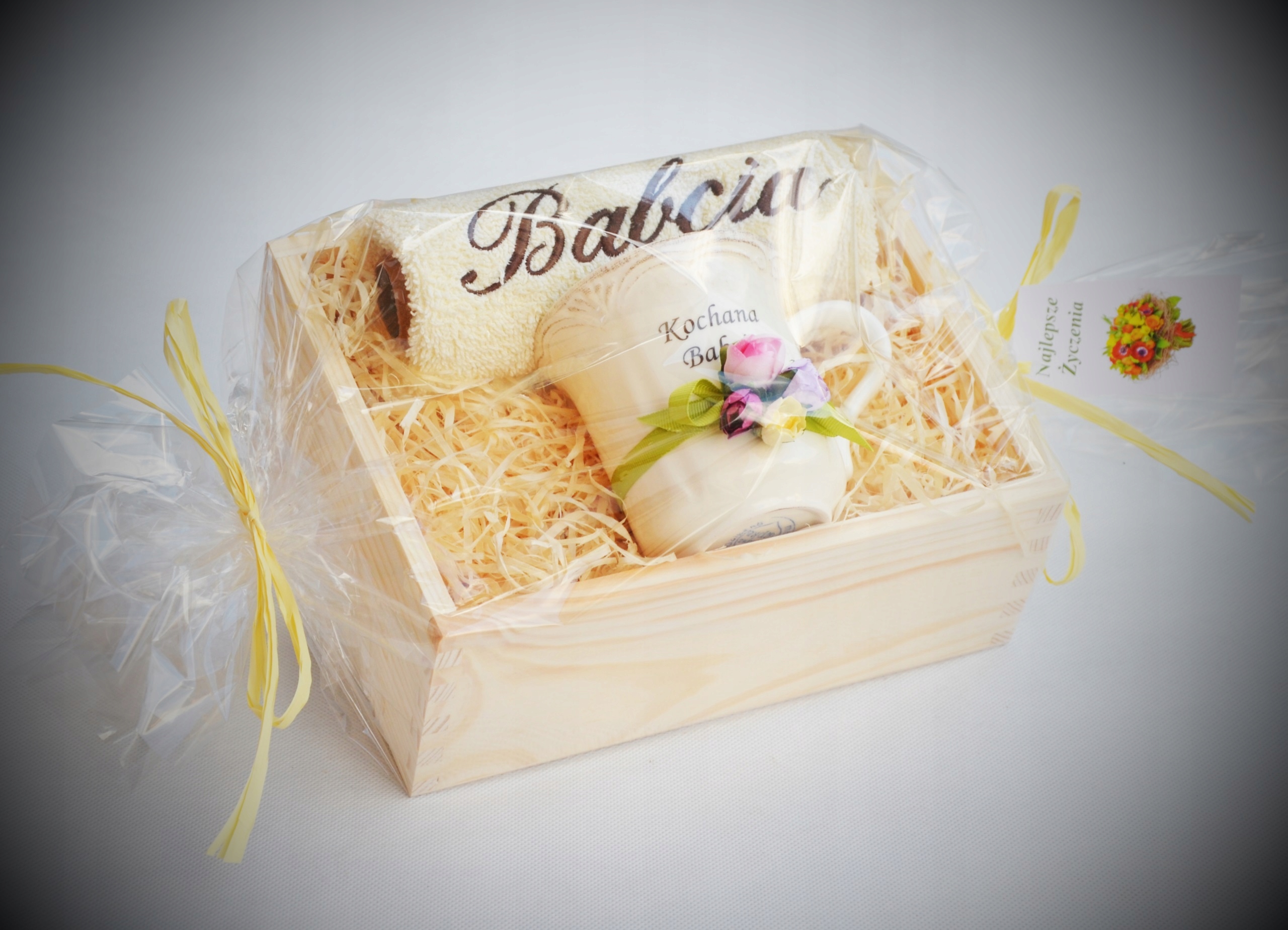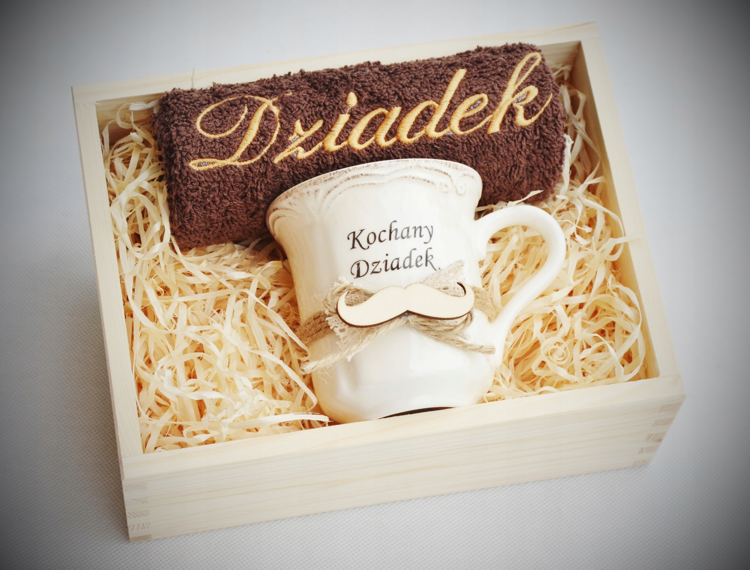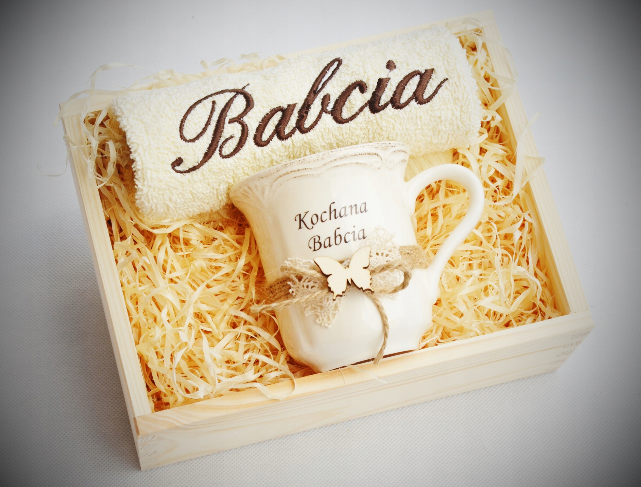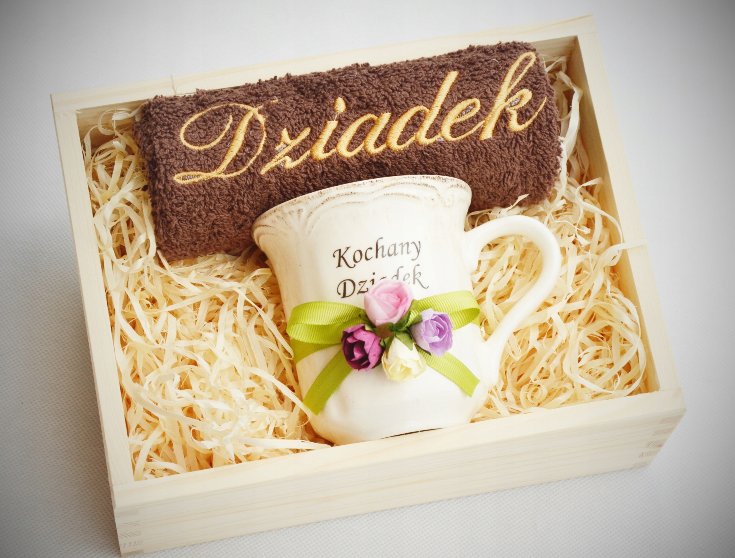 Красивый и практичный подарок ко Дню бабушки и дедушки — вышитое полотенце, фарфоровая кружка — все красиво оформлено и упаковано.