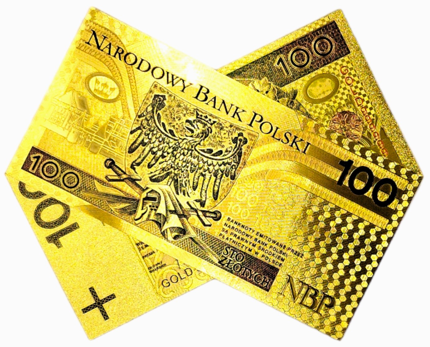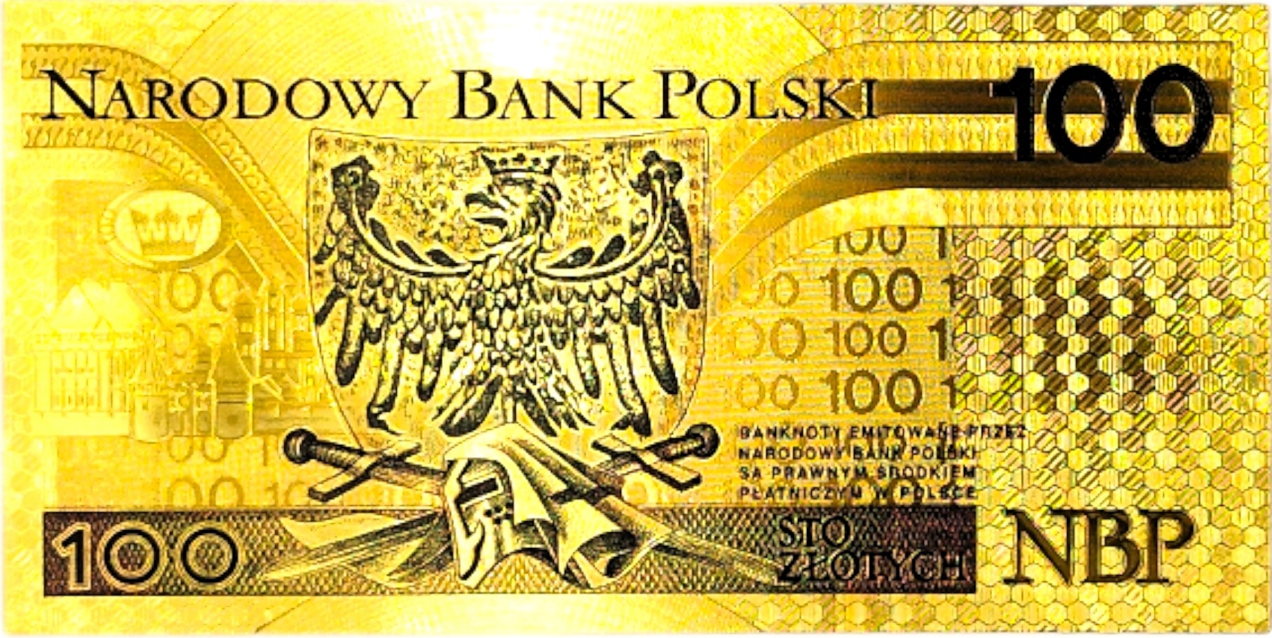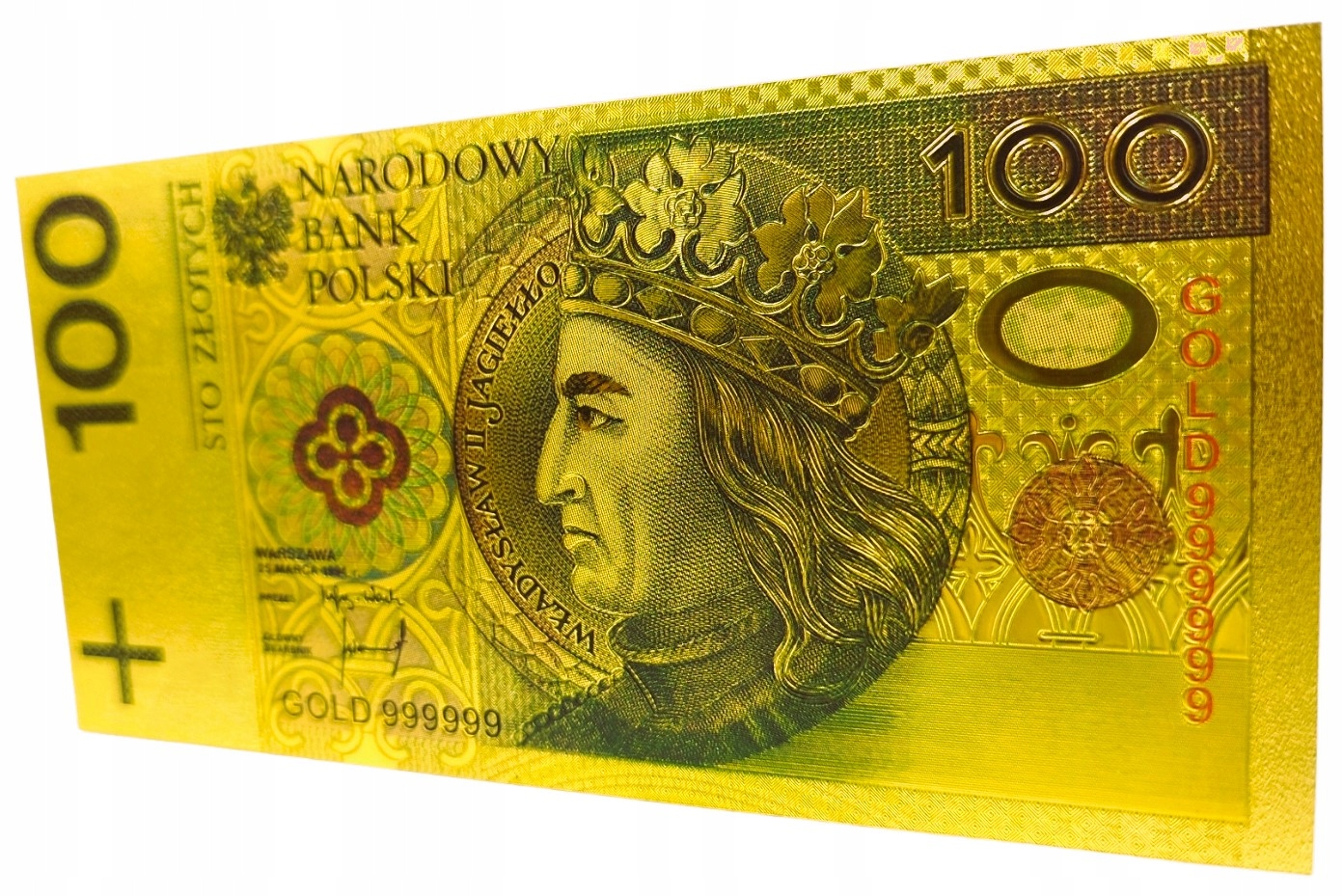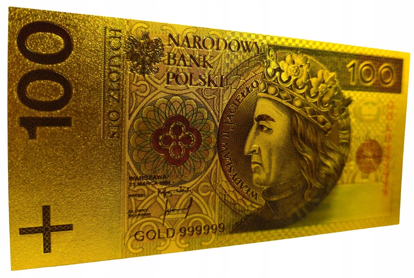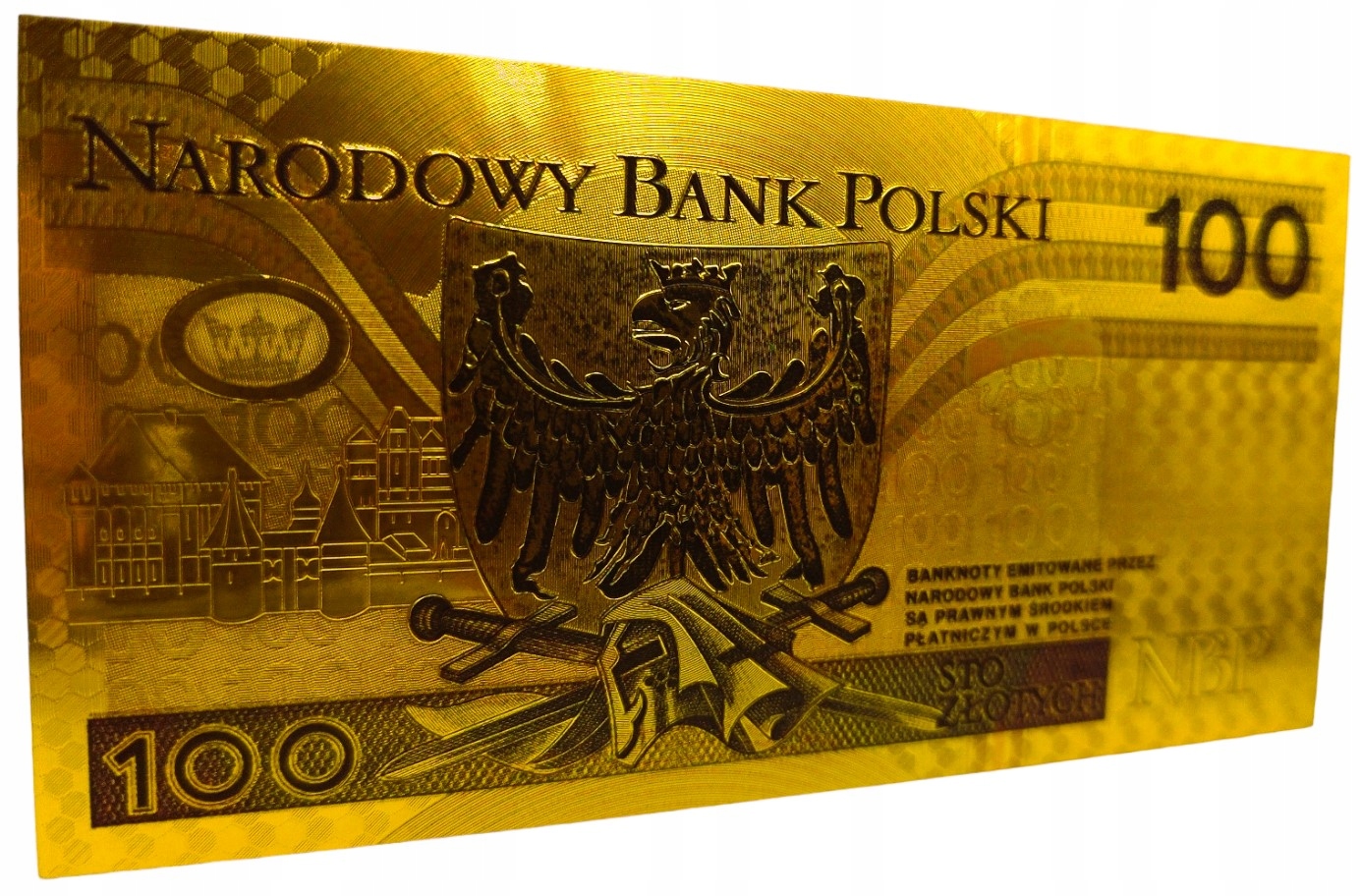 Точная копия польской банкноты того же номинала, изготовленная из ПВХ и покрытая золотой фольгой.