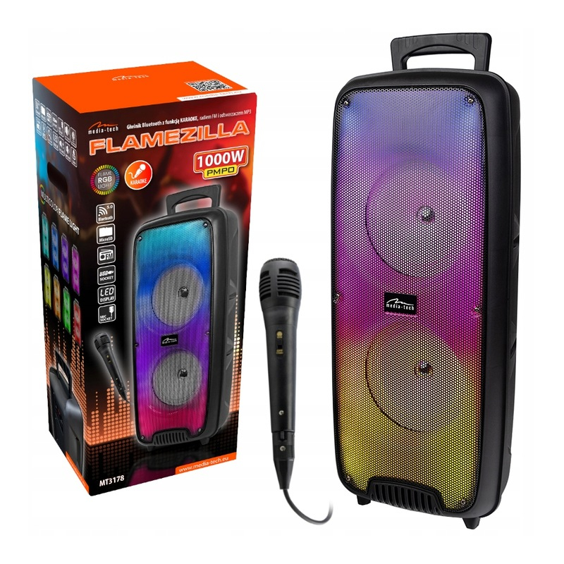 Media-Tech FLAMEZILLA MT3178 оснащен красочной RGB/FLAME-подсветкой, что, несомненно, добавляет ему характера и, прежде всего, создает неповторимую атмосферу во время мероприятий. Мерцающая красочная радуга или огни в ритме музыки заставят вас почувствовать себя на настоящем музыкальном мероприятии. Более того, разъем для микрофона jack 6,3 мм позволит вам подключить дополнительный аксессуар в виде микрофона (входит в комплект), благодаря чему вы сможете петь любимые песни с друзьями благодаря функции КАРАОКЕ.