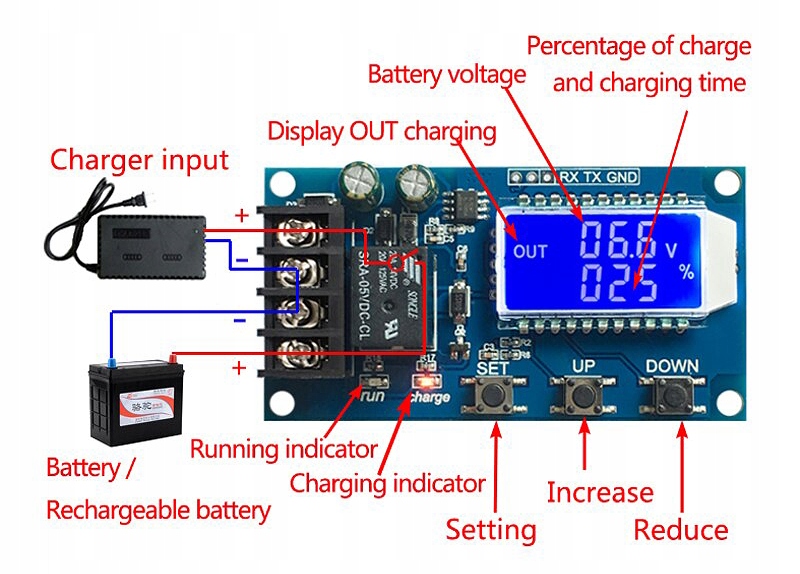 Установив верхний предел напряжения UP и нижний предел напряжения dn, реле включается, если напряжение на аккумуляторе ниже dn. Аккумулятор заряжается до достижения верхнего предельного напряжения. Затем реле выключается. Когда контроллер снова достигает нижнего предела напряжения, из-за циклической работы реле включается для подзарядки.
