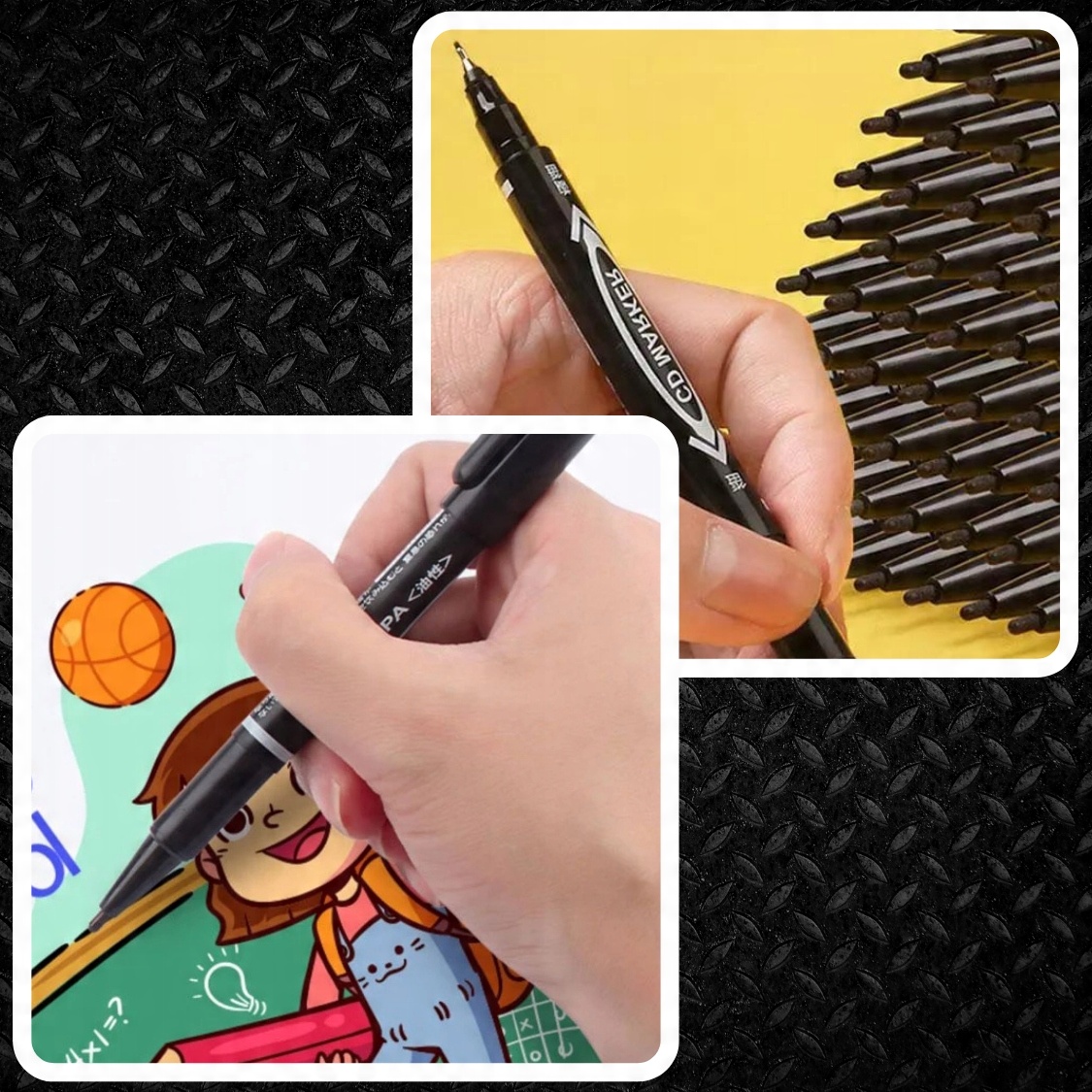 ✅ Маркер двухсторонний — универсальный продукт, который идеально подходит для дома, офиса и художественной работы. Универсальность этого инструмента позволяет писать на различных поверхностях, таких как дерево, ткань, стекло, металл, пластик, керамика, а также на CD/DVD-дисках.