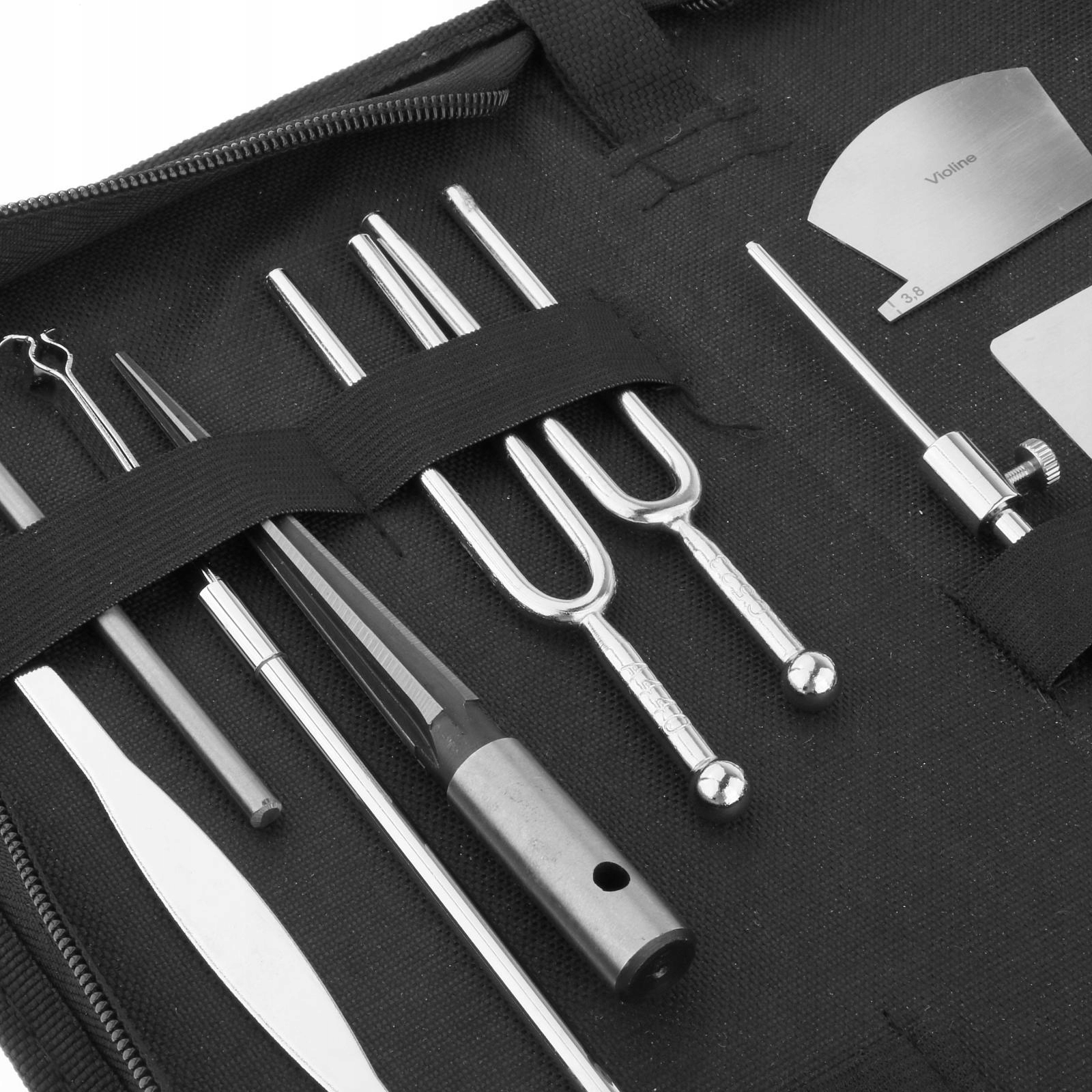 Набор инструментов для обслуживания из 11 шт. с сумкой для переноски, включая шумомер, зажим для извлечения, регулятор, эталонный инструмент для ремонта скрипичного моста, камертоны, краевые зажимы.