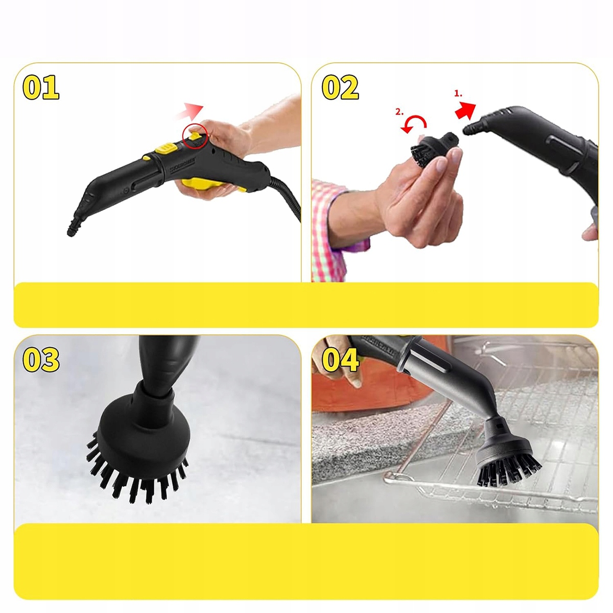 Желтые форсунки и удлиненная форсунка значительно увеличивают мощность очистки сопла точки, так что вы можете легко очистить швы, углы, края и другие твердые места. Слот -кисть эффективно очищает все виды пробелов и мертвых углубленных углублений.