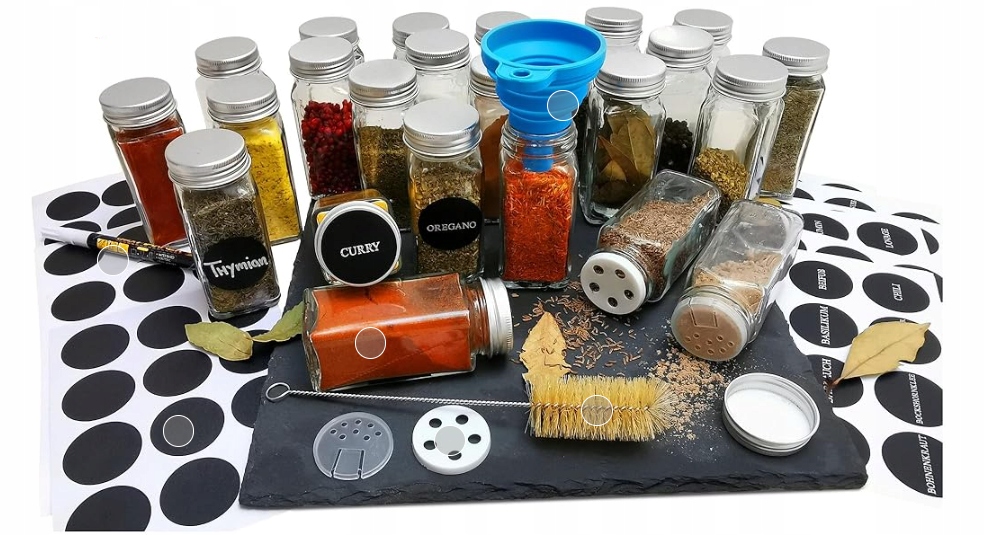Баночки для специй с крышкой — набор из 12 шт. — различные насадки для шейкера, воронка, кисточка, этикетки и мел (120 мл, 10,5 x 4,3 см)