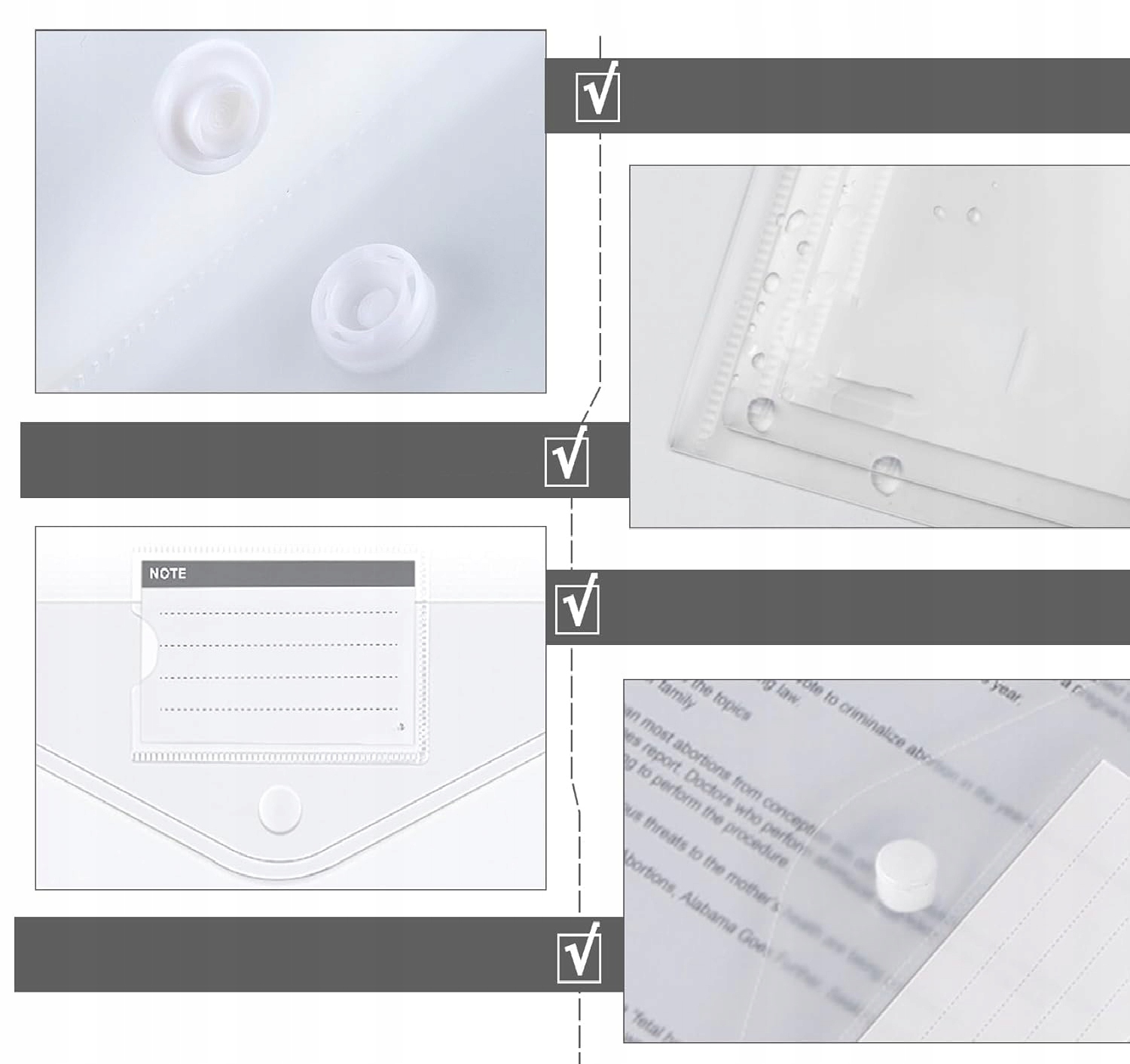 Эти прочные и водонепроницаемые папки для документов формата A4 изготовлены из высококачественного полипропилена (ПП) и легко открываются и закрываются одним нажатием кнопки, что делает их идеальными для безопасной переноски важных предметов. предметы.