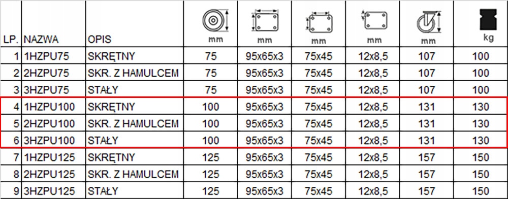 Комплект состоит из четырех колес, оснащенных пластинчатым креплением. В комплект входят два стационарных комплекта с кодом 3HZPU100K2 (поз. 6 в таблице), одно поворотное колесо с тормозом, код 2HZPU100K2 (поз. 5 в таблице) и одно поворотное колесо с кодом 1HZPU100K2 (поз. 4 в таблице).