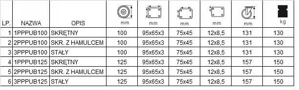 Комплект состоит из четырех колес, оснащенных пластинчатым креплением. В комплект входят два стационарных комплекта с кодом 3PPPUB125K2 (поз. 6 в таблице), одно поворотное колесо с тормозом, код 2PPPUB125K2 (поз. 5 в таблице) и одно колесо поворотное с тормозом. код 1PPPUB125K2 (позиция 4 в таблице).