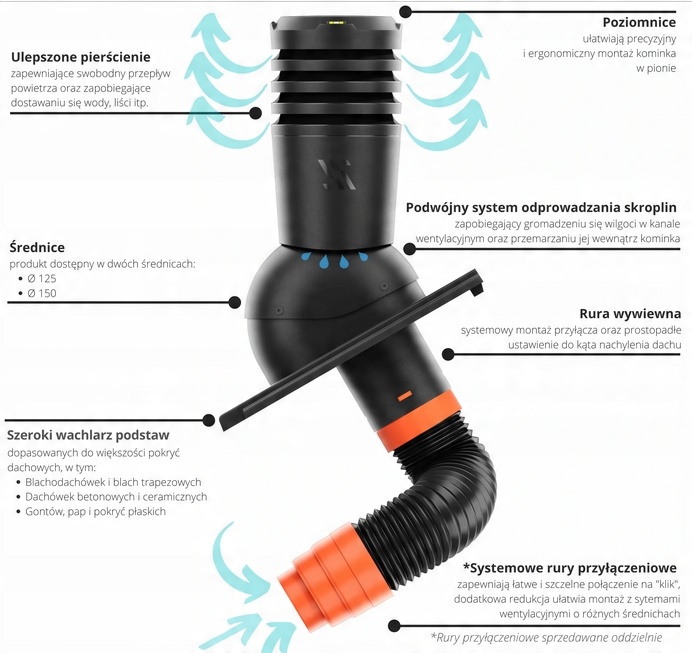 Комплексный регулируемый ЭКО-камин с отводом конденсата (5-45 градусов) под металлочерепицу, диаметр вентканала 125 мм, высота 46 см. С двумя встроенными уровнями для вертикального расположения камина, с вытяжной трубой, проходящей через скат крыши под углом 90 градусов.