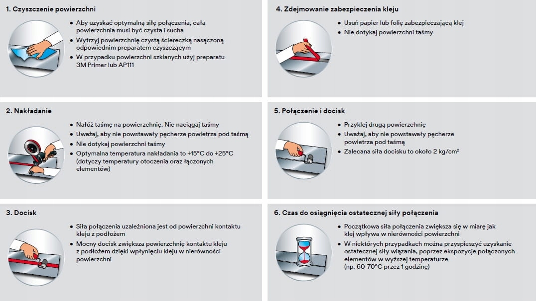 Самое важное при наклеивании любой ленты – правильно подготовить поверхности склеиваемых поверхностей. Если лента отваливается, то более 90% случаев указывают на плохо подготовленную поверхность. Для получения наилучшей адгезии склеиваемые поверхности должны быть обезжирены изопропиловым спиртом, чистые, сухие и очищенные от загрязнений. Ленту следует наносить при температуре 21-38°С. Ниже на рисунках шаг за шагом показан правильный процесс нанесения.