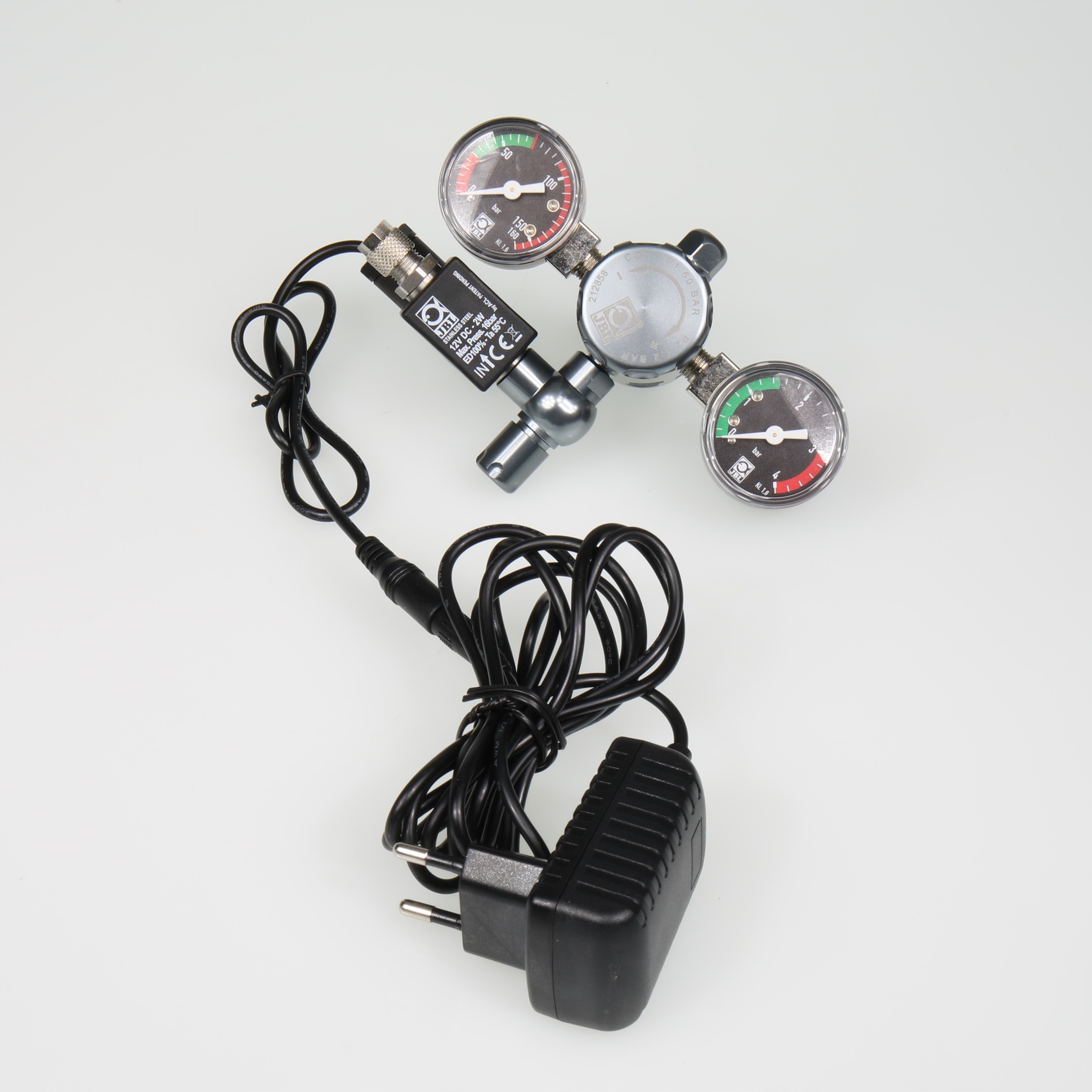 1 Редуктор давления CO2 с 2 манометрами (для рабочего давления и в баллоне) для многоразовых баллонов, с магнитным клапаном и съемным адаптером (позволяет адаптировать его к одноразовому баллону CO2) и электромагнитным клапаном 12 В.