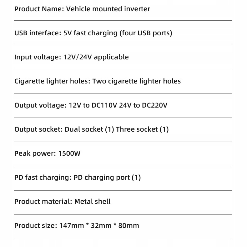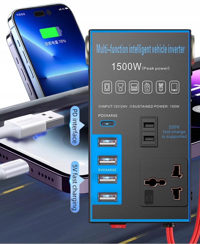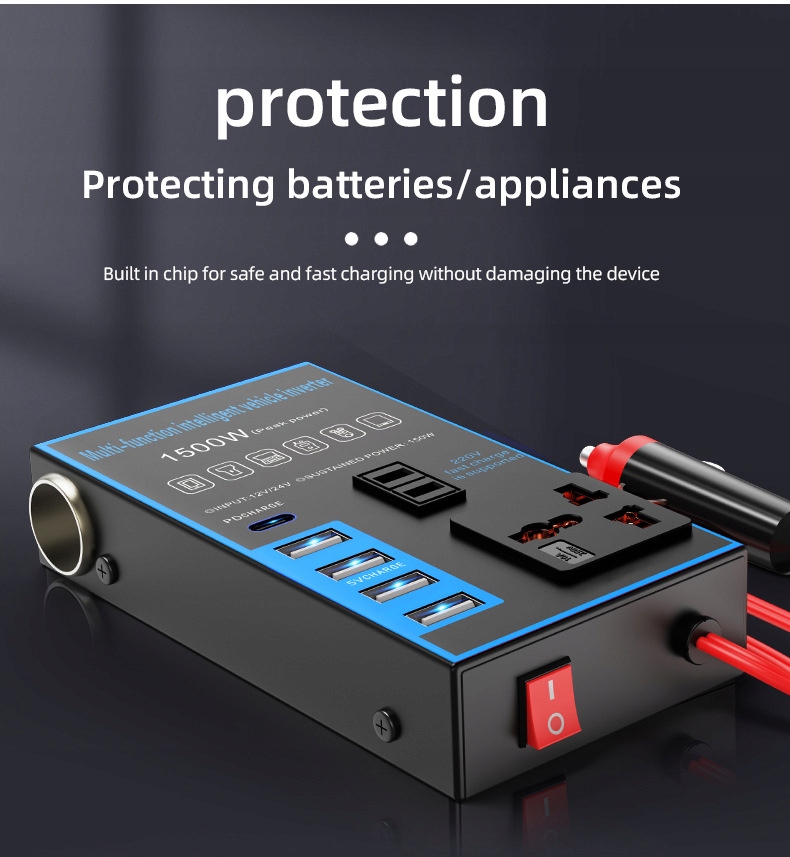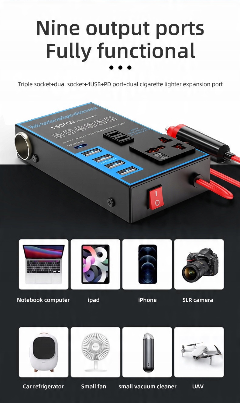 • Мощная производительность: с помощью расширенной технологии преобразования энергии она может эффективно трансформировать 12 В или 24 В постоянного тока автомобиля или грузовика в источник питания 220 В, с стабильной и надежной выходной мощностью для удовлетворения необходимости заряжать различные электронные устройства. Выходная мощность: поддерживает высокую выходную мощность к [конкретной мощности], которая может быстро заряжать ноутбуки, таблетки, мобильные телефоны и другие устройства, экономя время ожидания. В то же время он также может обеспечить стабильный источник питания для небольших электрических устройств, таких как небольшие пылесосы, автомобильные холодильники, вентиляторы и т. Д.
