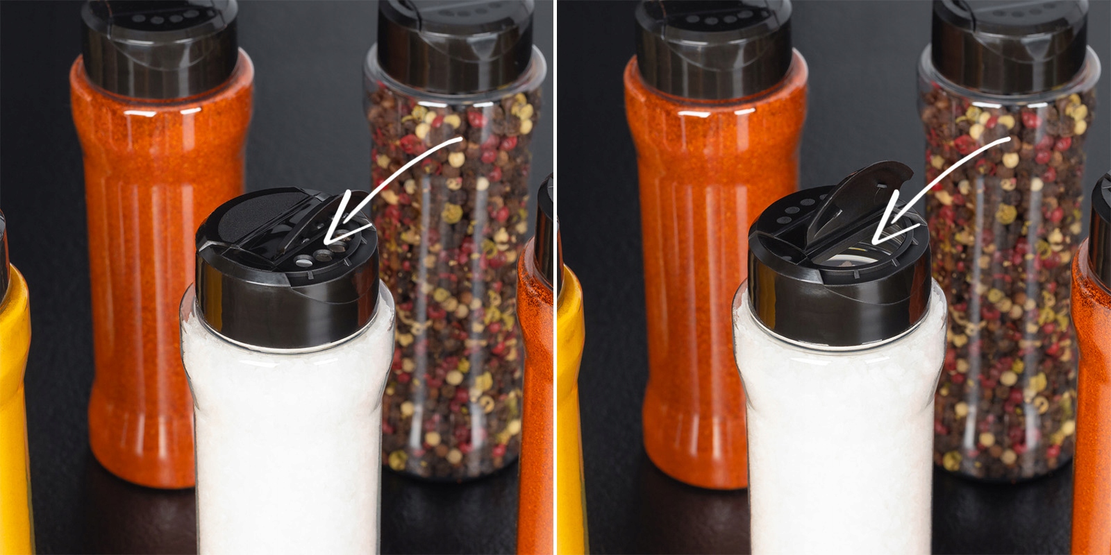 Контейнер имеет крышку с двумя типами дозировочных отверстий – с сеткой и без нее. Закрывая крышку, специи дольше сохранятся свежими.