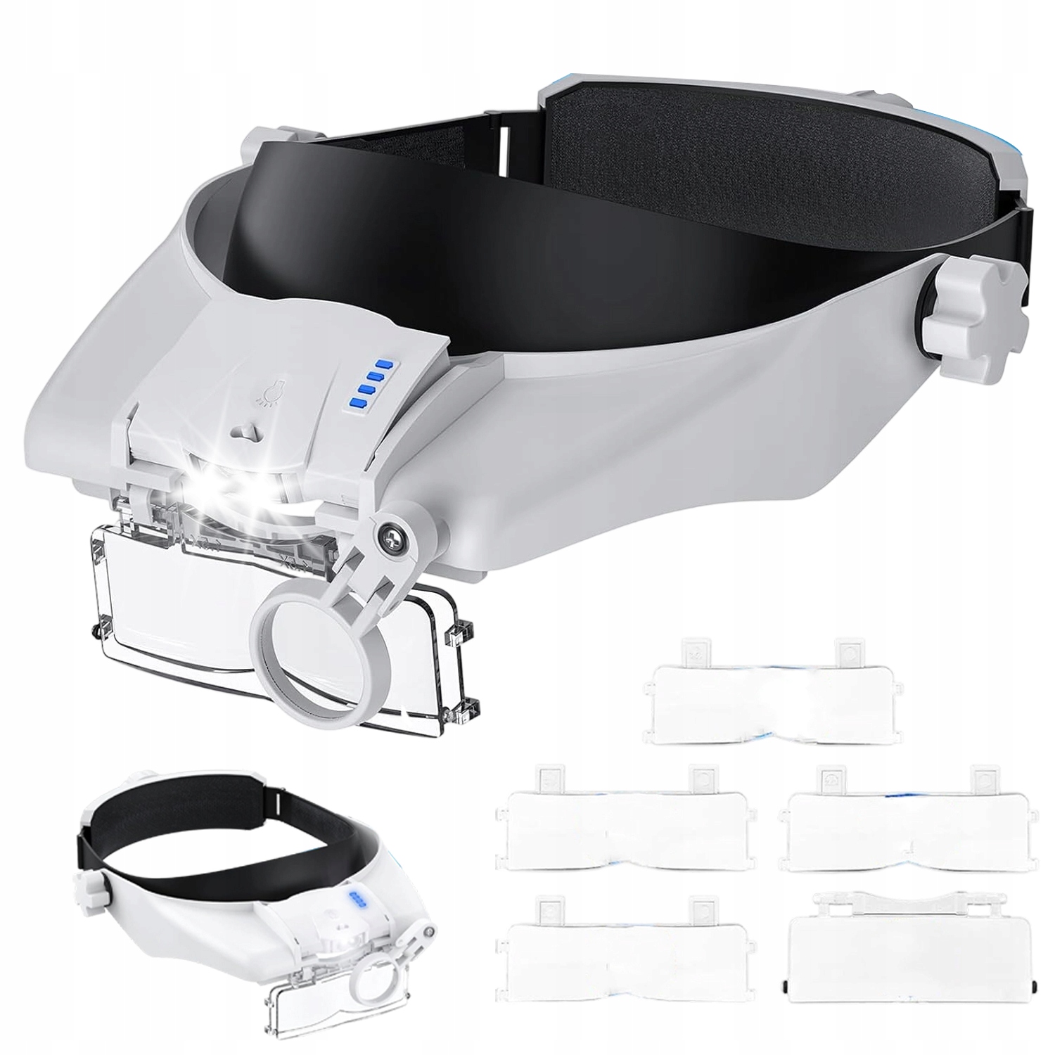 - Эта наголовная лупа со светодиодами оснащена 5 независимыми широкоугольными линзами с коэффициентами увеличения 1,5x, 2,0x, 2,5X, 3,0X и 3,5X. соответственно.