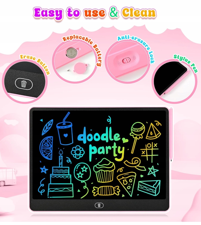 - Блокировка и стирание одним касанием: защитите свои творения, добавив дополнительную кнопку блокировки на задней панели, чтобы предотвратить случайное стирание! Закончив рисовать, разблокируйте свое устройство и нажмите кнопку стирания в нижней части экрана, чтобы стереть все содержимое. Обе функции просты и практичны, поэтому даже самые маленькие дети, которые еще не готовы использовать электронные устройства, смогут быстро приступить к работе.