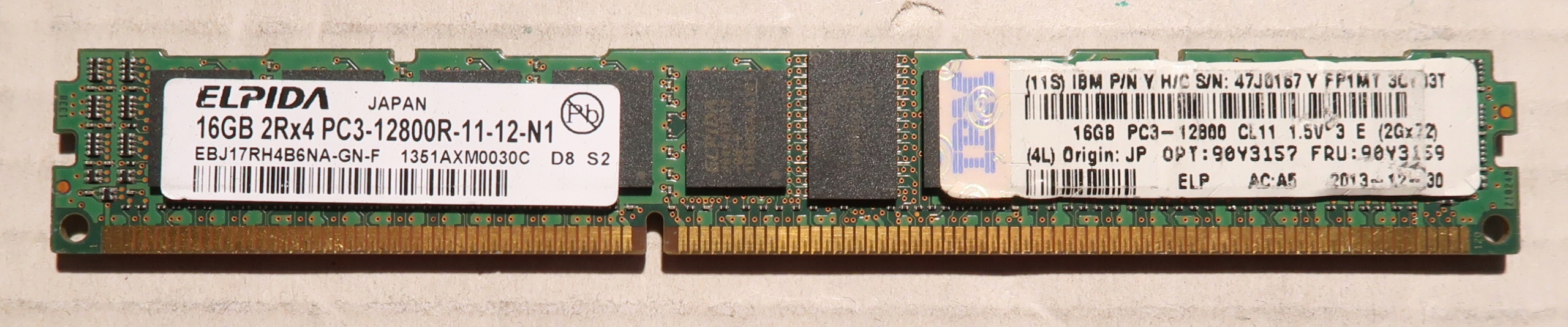 Полностью рабочая «серверная» память 16 ГБ DDR3 PC3-12800R 1600 МГц ECC-Registered RDIMM ELPIDA ELPIDA EBJ17RH4B6NA-GN-F (16 ГБ в одном кристалле).