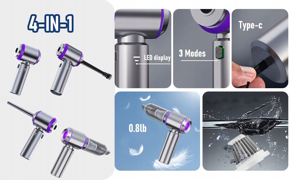 7 Функциональные аксессуары: Многофункциональные аксессуары для всех ваших потребностей. Длинная форсунка, кисть и длинная форсунка, тип управления и мусор. Насадка для волос обеспечивает сильный воздушный поток, чтобы быстро высушить сушилки или волосы. Заклинания могут сосать и раздувать организаторов работать. Защита животных может сосать пальто, когда ваш питомец чистка. Надувные форсунки могут надувать воздушные шары, плавательные тележки и т. Д.