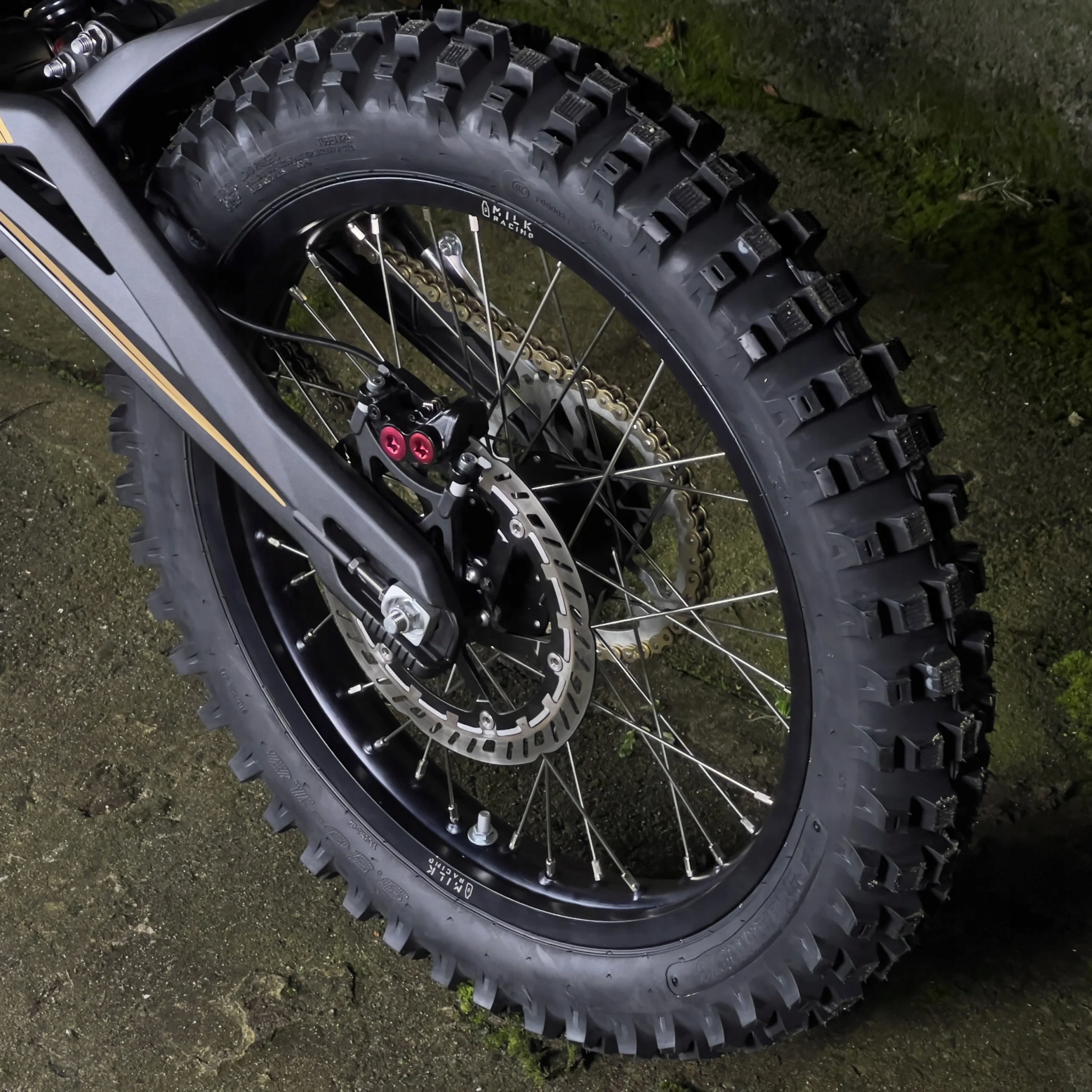 Особенности продукта: гоночный ободок с молоком: матовая анодирована, это обеспечивает большую сопротивление царапин, чем обычный лак. Обод более толстый, более широкий и прочный, чем OEM. OEM Surron Задний концентратор: 2 герметичных подшипника. Суррон тормозной отвертки спиц: 36x спицы из нержавеющей стали 2,6 мм/12 г сплечника: латунь, никелевая пластинка - более сильные и более устойчивы к коррозии, чем алюминий 6,5 мм Moto Nyple Moto (размером 5,5 мм): добавлено в стандарте. Мы хотим обеспечить наилучшее улучшение по лучшей цене. Замок обода предотвращает вращение шины на ободе, благодаря которой внутренний клапан трубки не будет сломан. Это позволяет вам ездить с более низким давлением, чтобы получить дополнительную сцепление и увеличить мощность, не опасаясь клапана трубки. Бронтинг: 3 -верный шаблон - самый мощный из возможных шин - 100% вариант Plug & Play, который мы предлагаем посадки на шины, благодаря которой колеса готовы ездить на вилке и играть прямо из коробки. Universal Standard Off -Hroad Tire -Отлично подходит для всех приложений Enduro/Country -Cross/Motocross Возможность модифицировать колеса для соответствия супер широкой модификации шин требуется, чтобы шина не мешала цепочке.