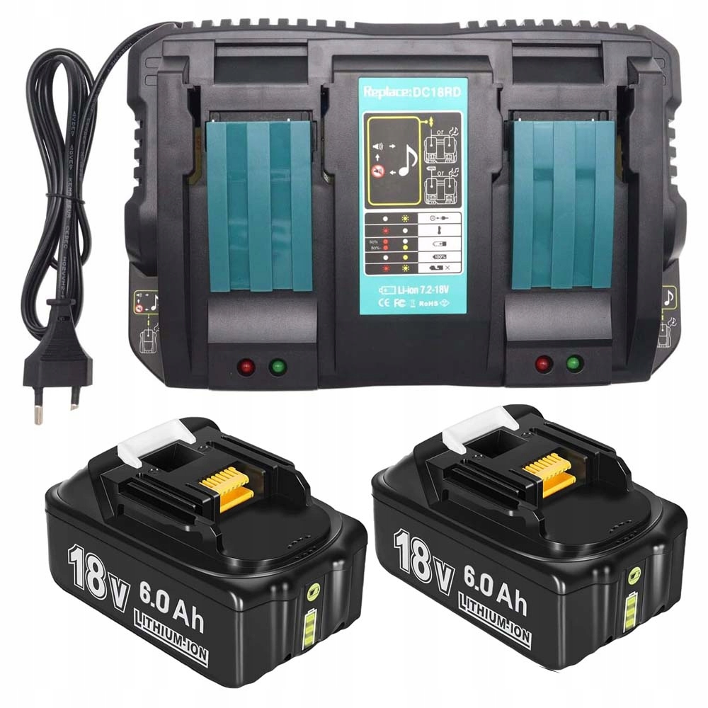 🎁🎁【Спецификация】Тип: литий-ионный | Напряжение: 18 В | Емкость: 6000 мАч/6,0 Ач | Замена аккумулятора Makita 18 В со светодиодным дисплеем | Комплектация: 2 сменных аккумулятора Makita 18 В емкостью 6000 мАч. 1 двухпортовое зарядное устройство DC18RD на 6 А.