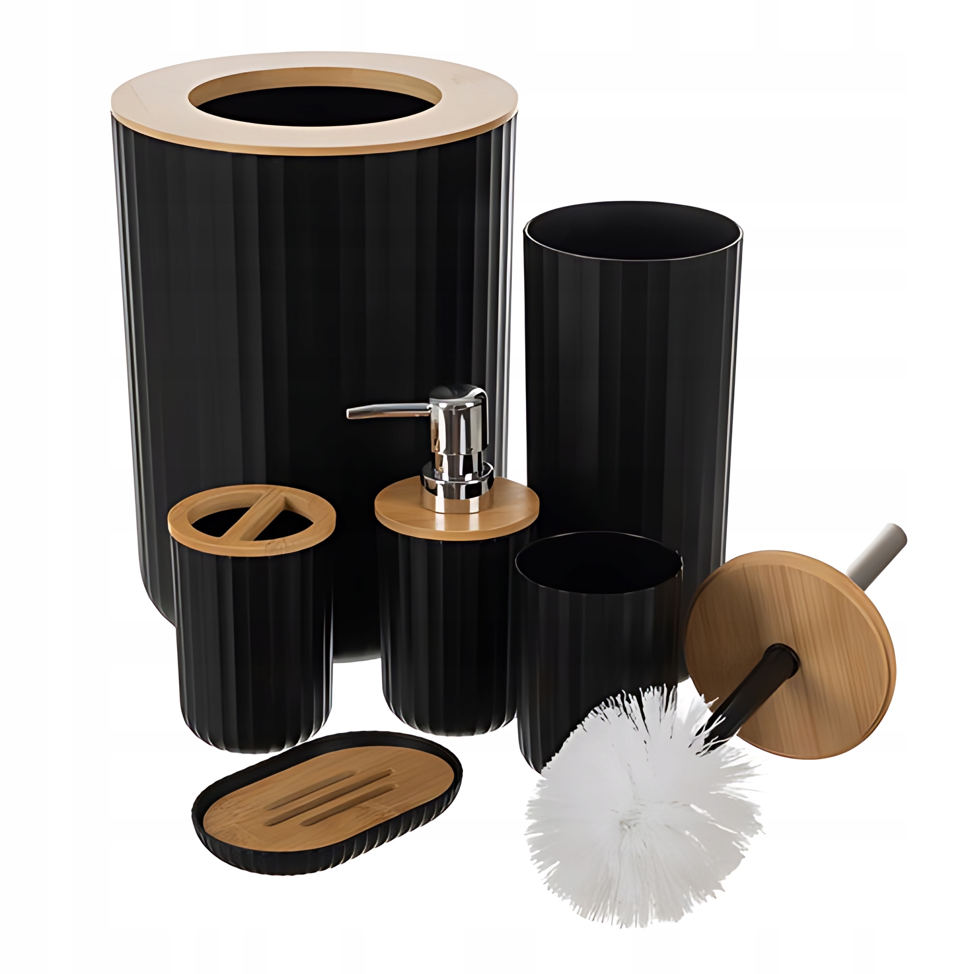 НАБОР ИЗ 6 АКСЕССУАРОВ ДЛЯ ВАННОЙ КОМНАТЫ - набор из 6 аксессуаров для ванной комнаты из высококачественного материала ПП с фурнитурой из бамбука представляет собой идеальное сочетание функциональности и элегантности. Черный цвет и зубчатая внешняя поверхность аксессуаров придают интерьеру современный характер, обеспечивая при этом комфорт и гигиену использования.