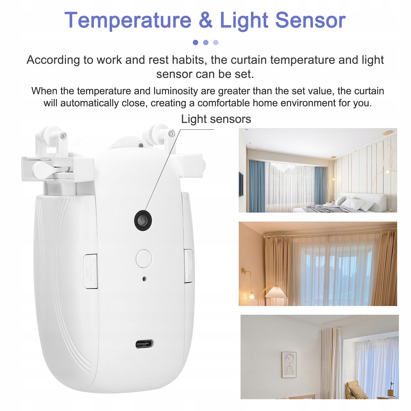 3. Температура \ U0026 Датчик света: в соответствии с рабочими привычками и отдыхом вы можете установить температуру и датчик света занавеса. Когда температура и яркости выше определенного значения, занавес будет автоматически закрыт, создавая для вас удобную домашнюю среду.