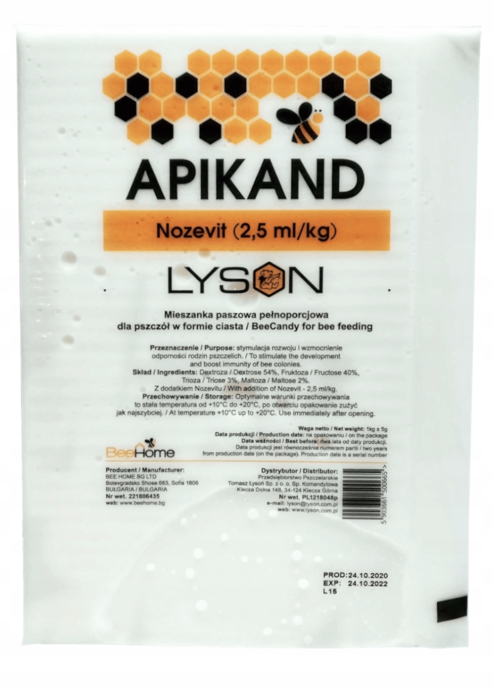 ТОРТ (КОРМ) ДЛЯ ПЧЕЛ АПИКАНД НОЗЕВИТ - это 1килограммовые пакеты, в которых после вырезания отверстия с одной стороны и размещение на рамках становится доступным для пчел.Тесто полезно для стимуляции весеннего развития или для подкормки в периоды неурожая. Он не высыхает и не стекает по рамам. Пчелы очень хотят есть.