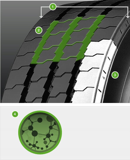 - Сплошная плечевая часть протектора обеспечивает хорошую поперечную устойчивость и износостойкость.