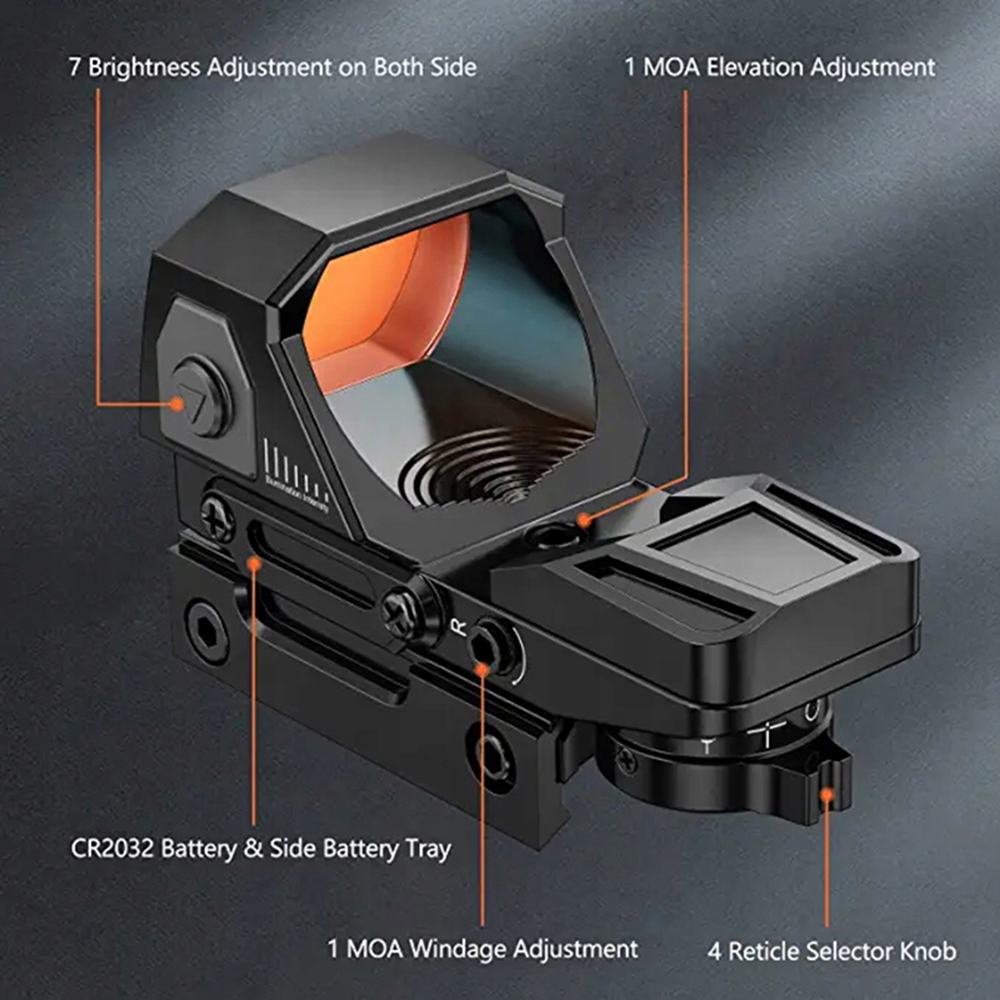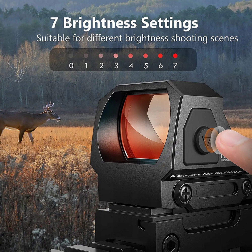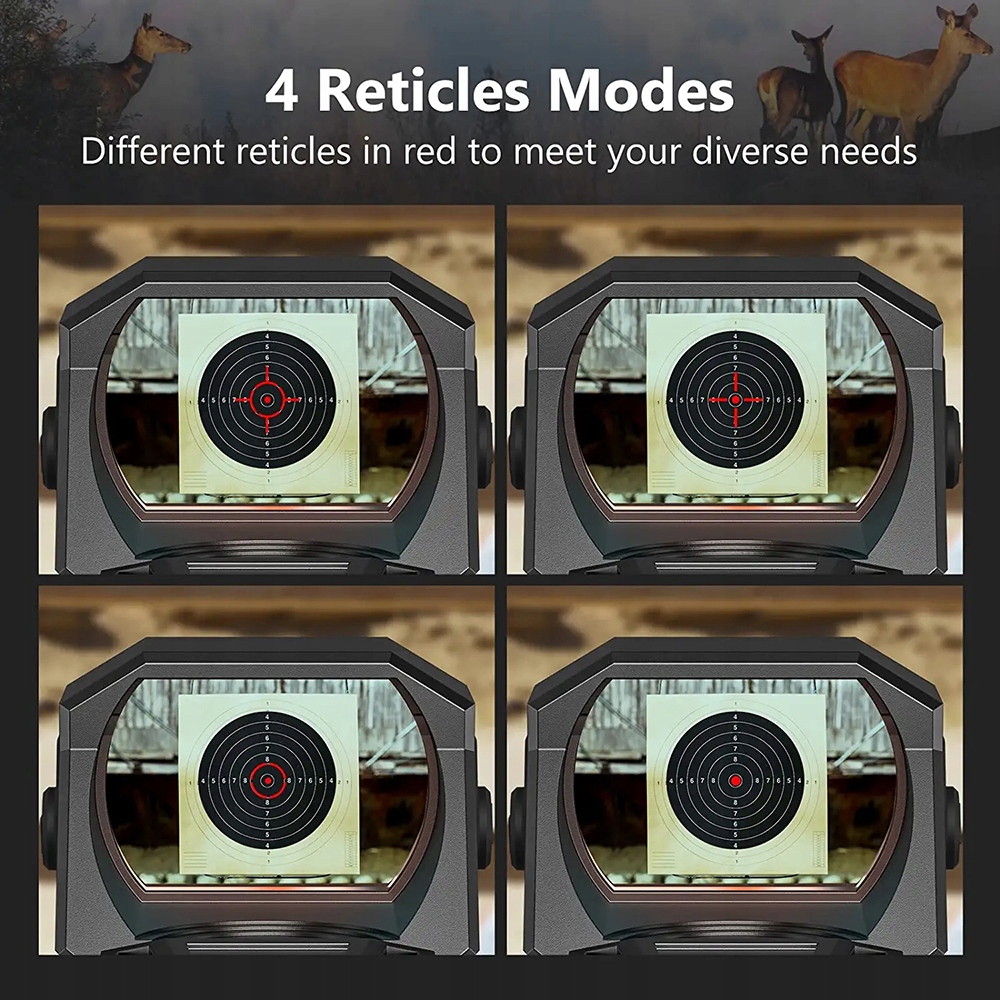 ----- Красная подсветка и несколько сеток: коллиматорный прицел с красной точкой с 4 формами сетки и 7 настройками яркости предоставляет вам различные возможности в разных случаях, например, в солнечный или пасмурный день. Дизайн кнопок позволяет легко регулировать яркость.