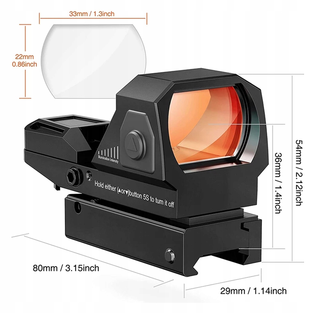 ----- Объектив широкого обзора 33 мм: Коллиматорный прицел с объективом 33 мм обеспечивает широкое поле зрения для быстрого прицеливания. Многослойное антибликовое покрытие повышает четкость изображения и увеличивает светопропускание в условиях низкой освещенности, помогая вам лучше видеть.