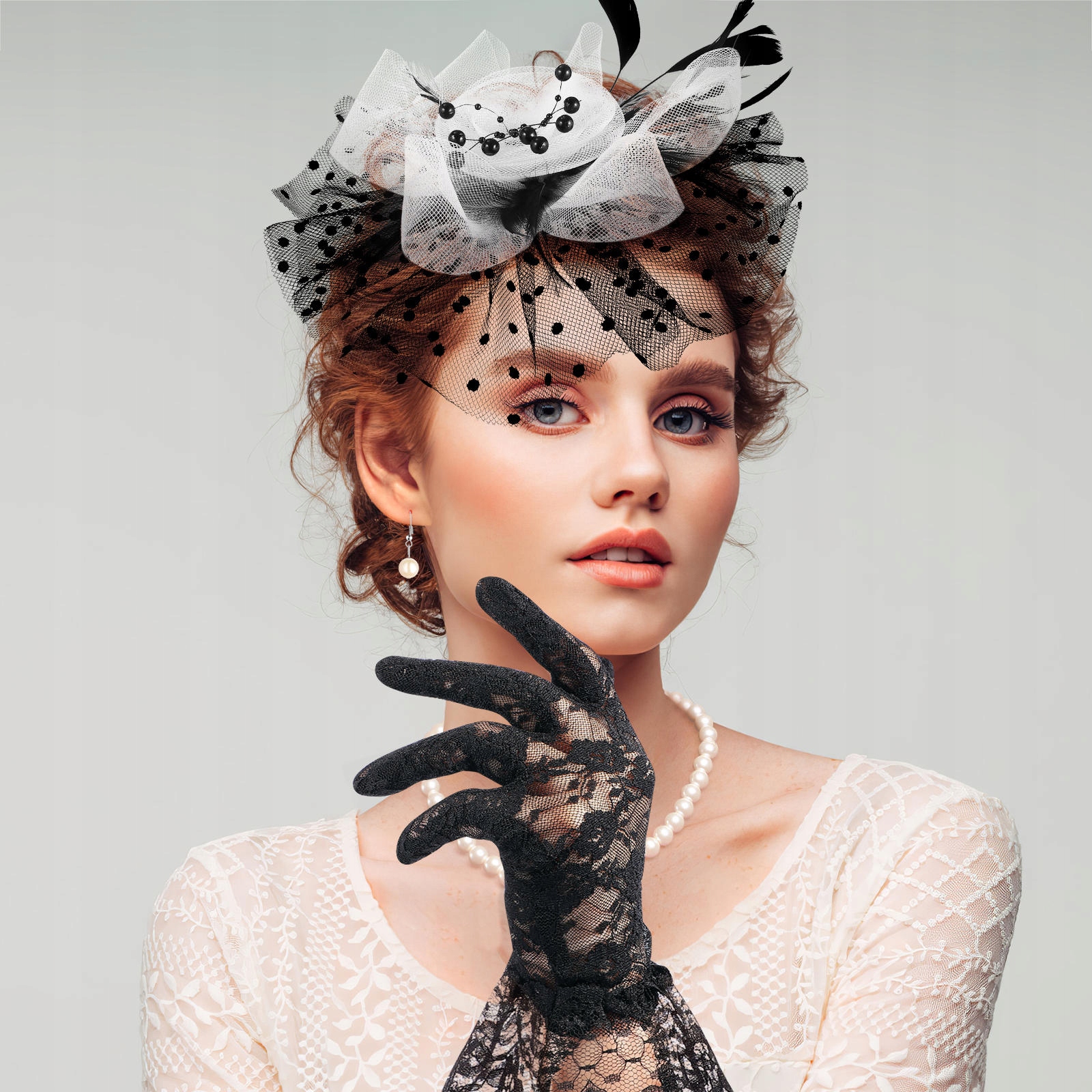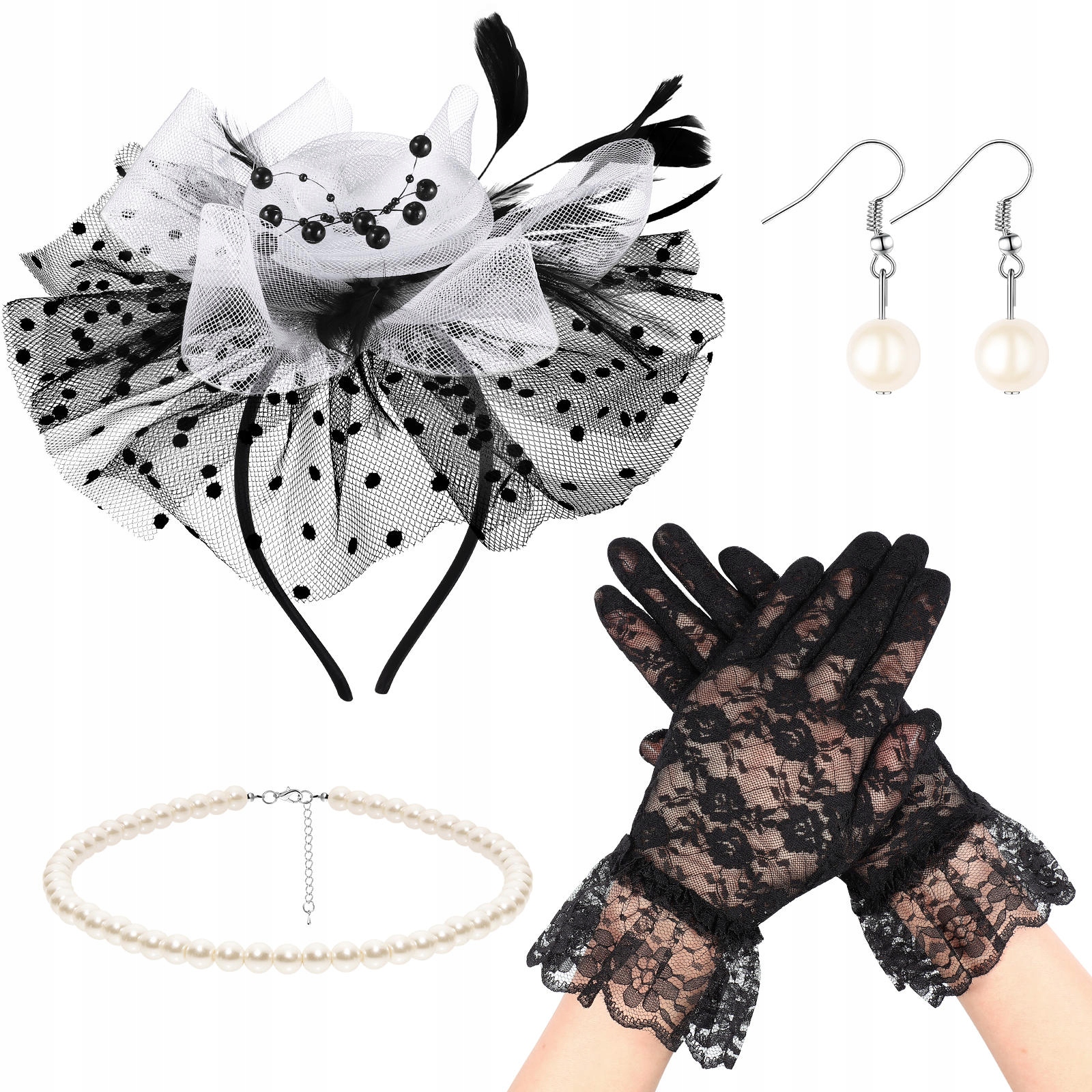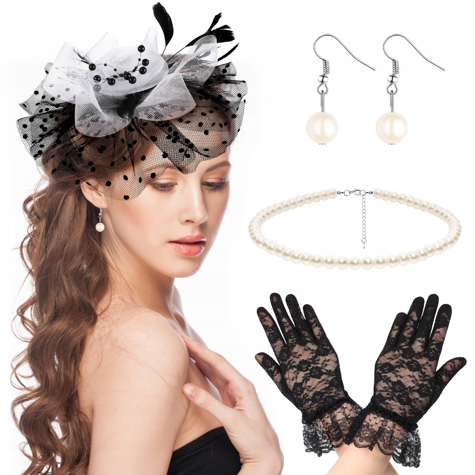 ✅Красивый и загадочный, все ощущения, которые вы хотите испытать, можно передать с помощью нашей сетчатой повязки на голову и перчаток. С комплексным украшением наряда, простым и элегантным жемчужным ожерельем и серьгами, красивым цветочным головным убором и кружевными перчатками, подходящими для коктейльной вечеринки или других случаев.
