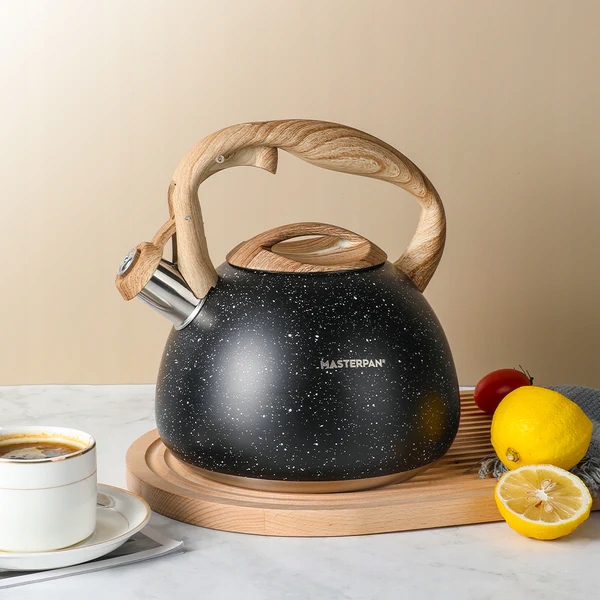 2.8L Стальной чайник со свистом, элегантный черный с деревянной ручкой