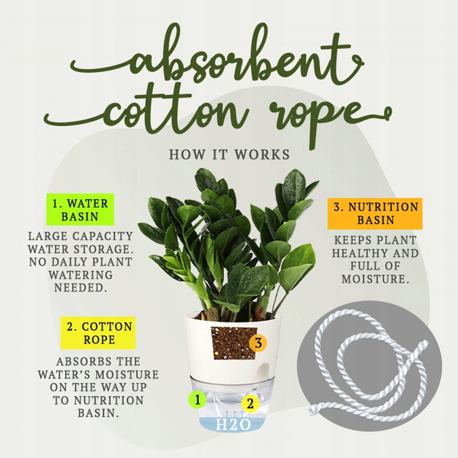 Хлопковая веревка впитывает воду из бассейна. Создает влагу, которая достигает внешнего источника, удерживая установку и дополнительную влагу. Избегайте постоянного полива и позвольте горшку помочь в работе в саду.