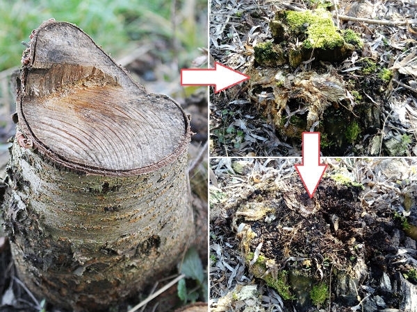 Срок разложения стволов и ветвей колеблется от полугода до даже трёх. лет и зависит от погодных условий, влажности ствола, твердости древесины, диаметра ствола и соответствующего применения препарата.