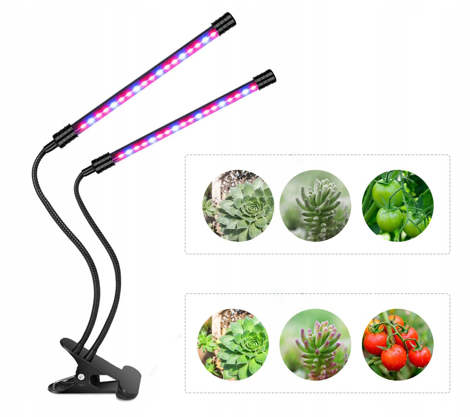 Специализированный светильник для поддержки роста и размножения растений. Оснащенный лентой со светодиодами двух цветов: красного и синего, общей мощностью 20 Вт, он излучает 3 типа световых волн (красный, синий, фиолетовый) разной длины для поддержки двух ключевых процессов в селекции растений: фотосинтеза. и фотопериодизм. Работа лампы способствует правильному питанию растений и контролю соответствующих биологических часов.