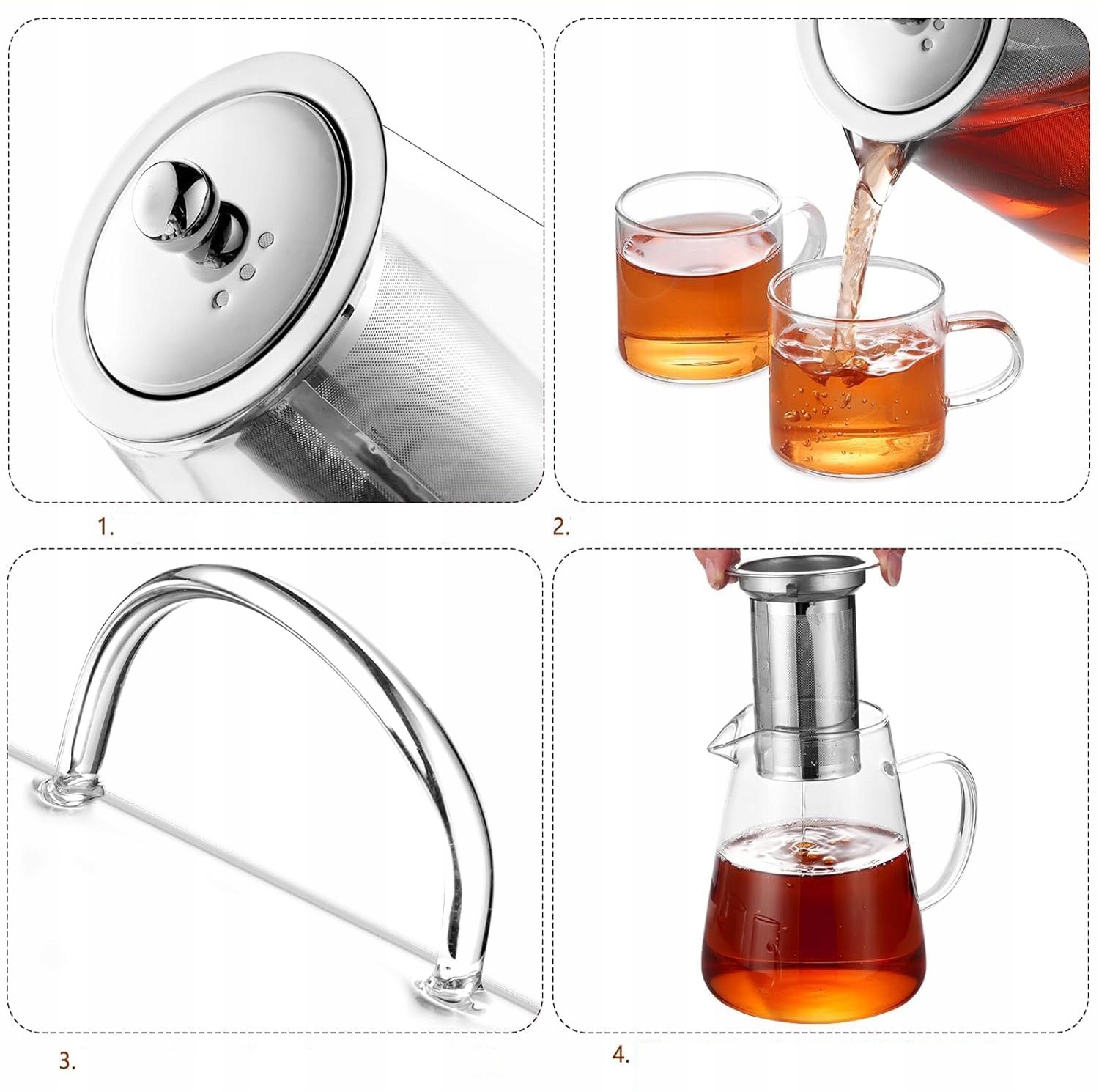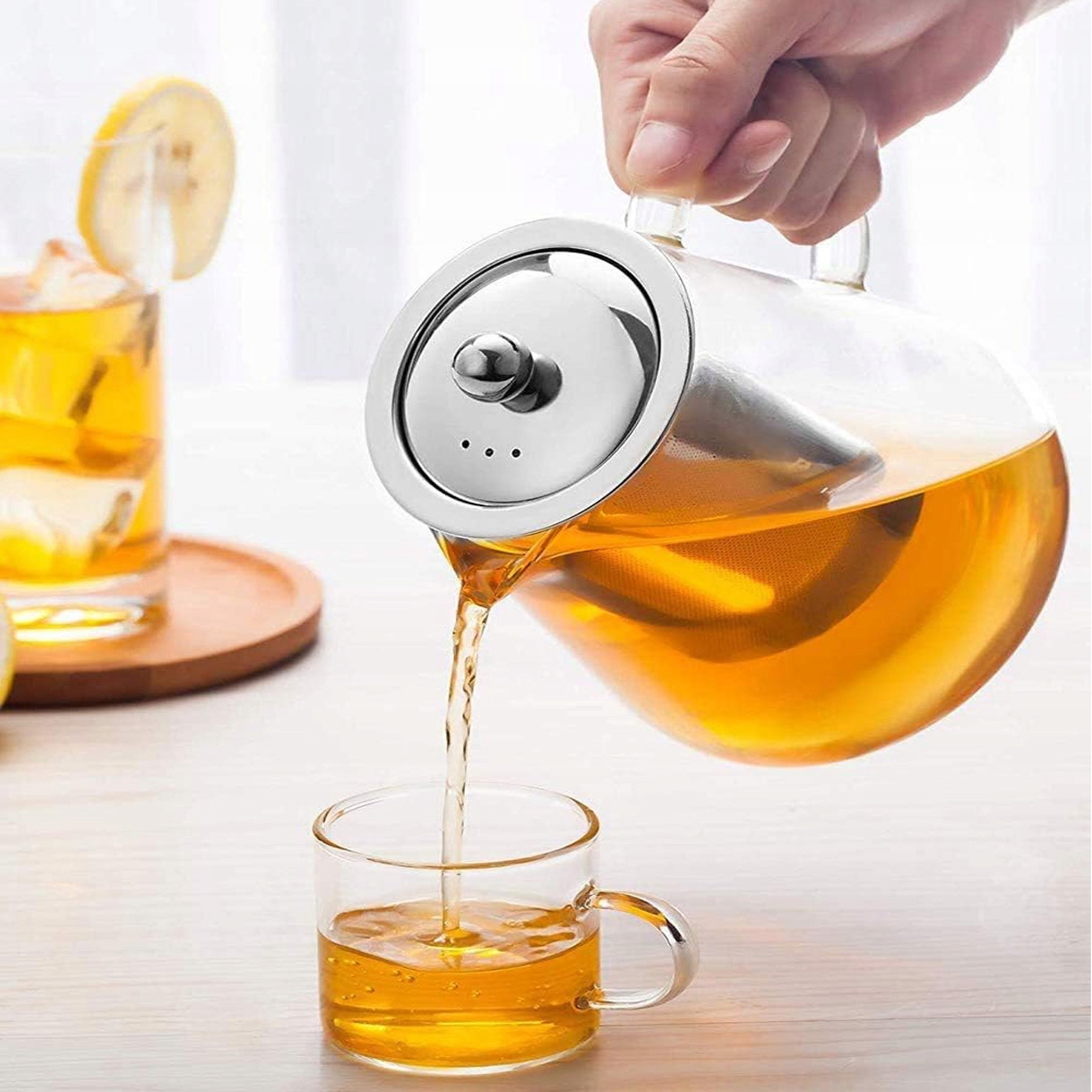 Этот стеклянный чайник оснащен съемным стеклянным фильтром. Этот стеклянный чайник с ситечком изготовлен из нержавеющей стали и оснащен сверхтонким фильтром, который фильтрует большинство видов чая. С помощью этого ситечка можно заваривать листовой чай, чай в пакетиках, чай «Цветущая гора», фруктовый и травяной чай.