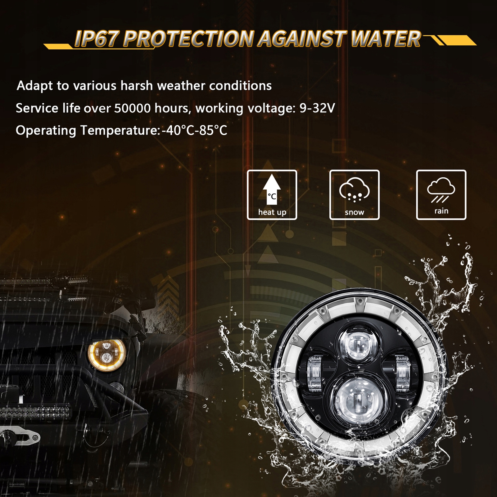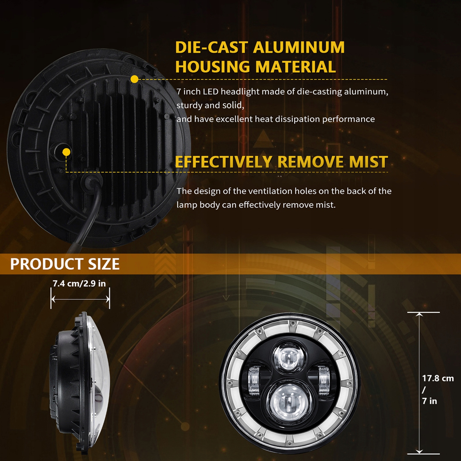 2. Повышенная яркость и универсальность. Эта 7-дюймовая круглая светодиодная фара обеспечивает более яркое освещение по сравнению со стандартными галогенными лампами и предлагает 4 режима освещения: белый дальний свет, ближний свет, дневной ходовой свет и желтый указатель поворота. Подходит для более безопасного вождения в условиях плохой видимости, таких как ночь, туман или дождь.