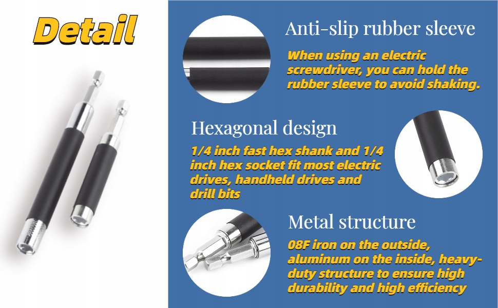 Об этом изделии Держатель из твердого металла, прочная конструкция обеспечивает длительный срок службы. Держатели бит рассчитаны на выдвижение и могут быть удлинены простым нажатием. Быстроразъемный шестигранный хвостовик 1/4 дюйма и шестигранная головка 1/4 дюйма подходят для большинства электрических устройств. отвертки, ручные отвертки и биты Небольшой размер позволяет брать с собой удлинитель бит куда угодно для выполнения любой работы и может поместиться в любую сумку для инструментов. Очень полезно вынимать или затягивать большое количество винтов после того, как вы их закрутили или ослабили.