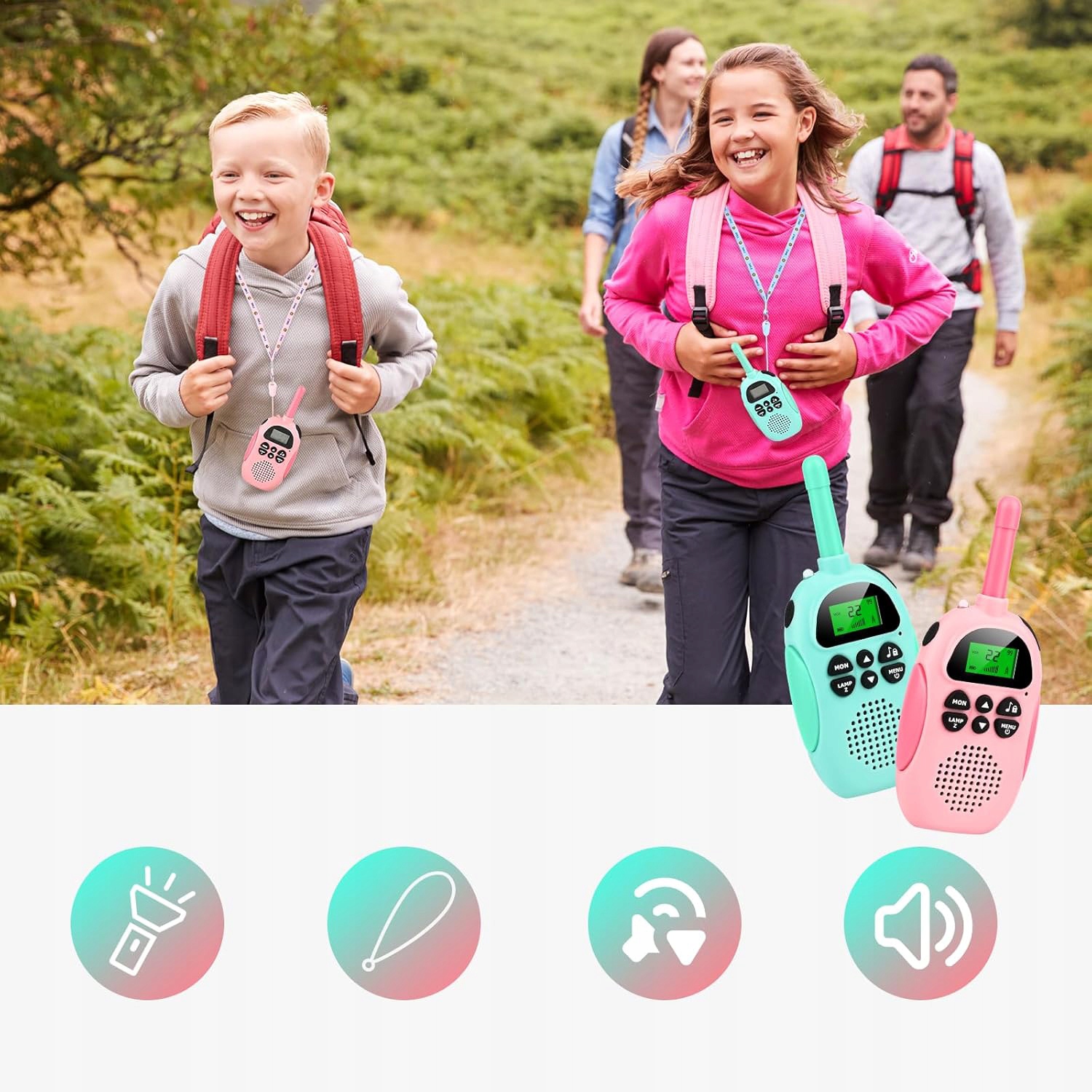 💪🧡 【Безопасность является приоритетом】 безопасность вашего ребенка является наиболее важной для нас. Вот почему мы оборудовали каждую рацию для разговора для ребенка с 16 каналами, 99 кодами конфиденциальности и созданным фонариком. Walkie Talkie для детей также позволяет в реальном времени следить за ребенком и всегда гарантирует его безопасность. Идеально подходит для маленьких рук, боковая кнопка проста в использовании. Благодаря функции Vox, эти ходы -talkies разрешают разговор без необходимости нажимать кнопки.