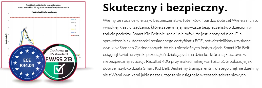 Smart Kid Belt имеет сертификаты безопасности ECE и FMVSS. Согласно ПДД (гл. 5, п. 1, ст. 39, п. 3) его можно использовать для перевозки детей в транспортных средствах без наложения штрафа.