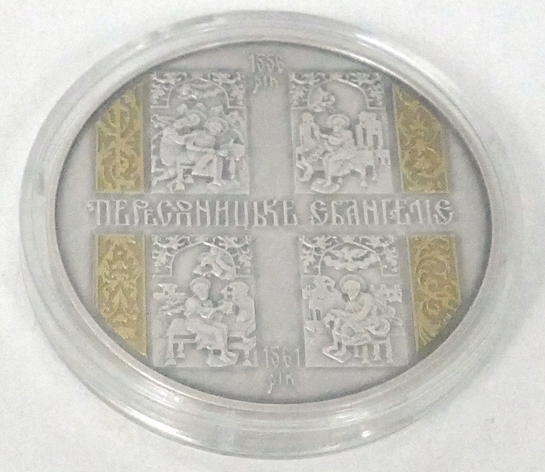 Монета из серии «Духовные сокровища Украины», посвященная духовному наследию Украины. Посвящается Пересопницким Евангелиям — сборнику из четырех новозаветных евангелий, написанных между 1556 и 1561 годами и известному как старейший сохранившийся перевод на русинский (староукраинский) язык. Монета защищена оригинальной капсулой, поставляется с футляром для хранения и сертификатом подлинности.